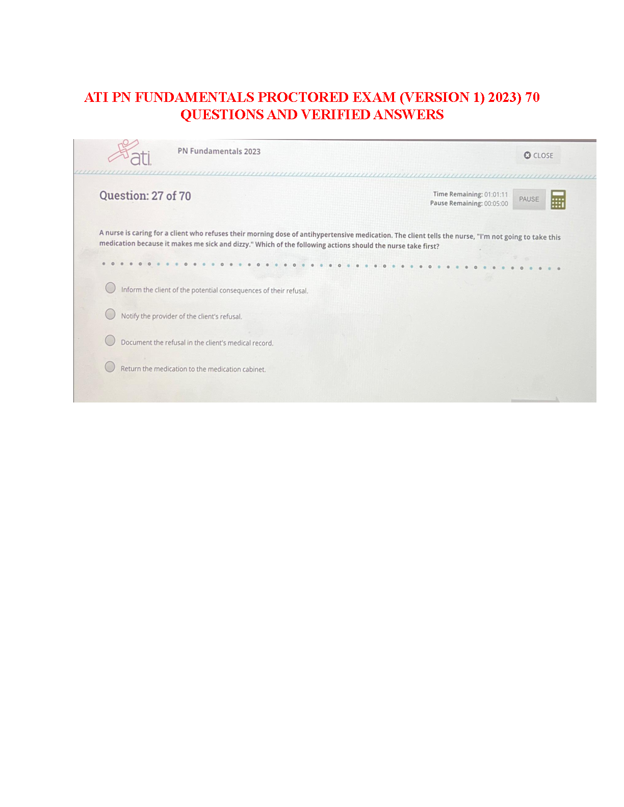 ATI PN Fundamentals Proctored Exam (Version 1) 2023: 70 Questions and Verified Answers by Assessment Technologies Institute