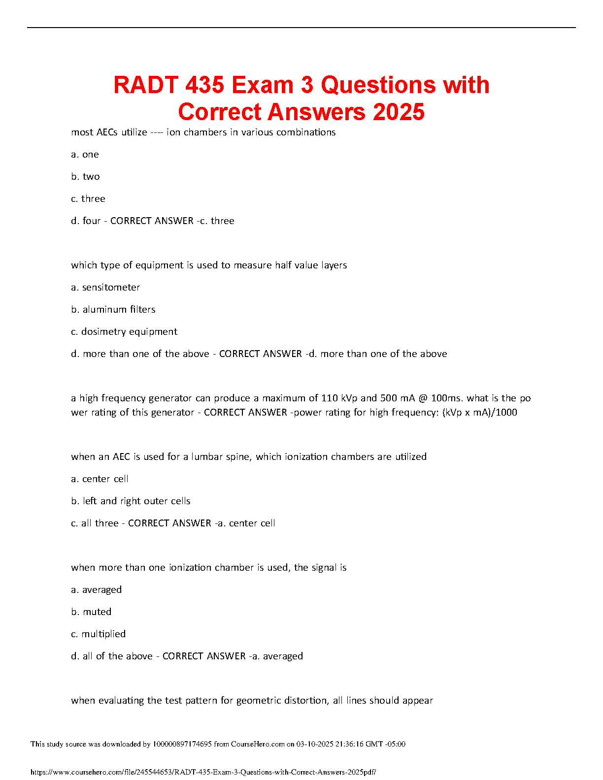 RADT 435 Exam 3 Questions with Correct Answers 2025 by [Author's Name - Unable to find author's name from the provided content or online resources]