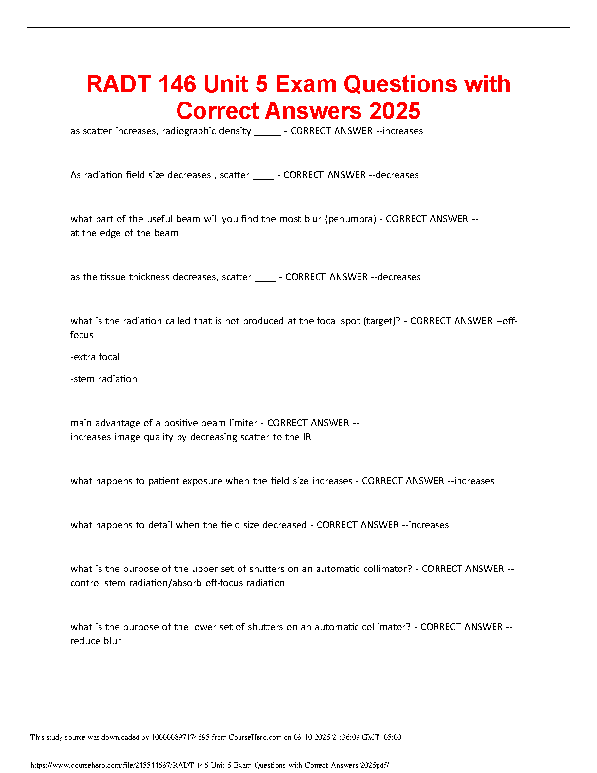 Ace your RADT 146 Unit 5 exam with this comprehensive question and answer resource. Perfect for first-time test takers aiming to avoid resits, this guide provides a thorough review of key concepts. Master radiographic density, scatter radiation, beam limiters, and more!
