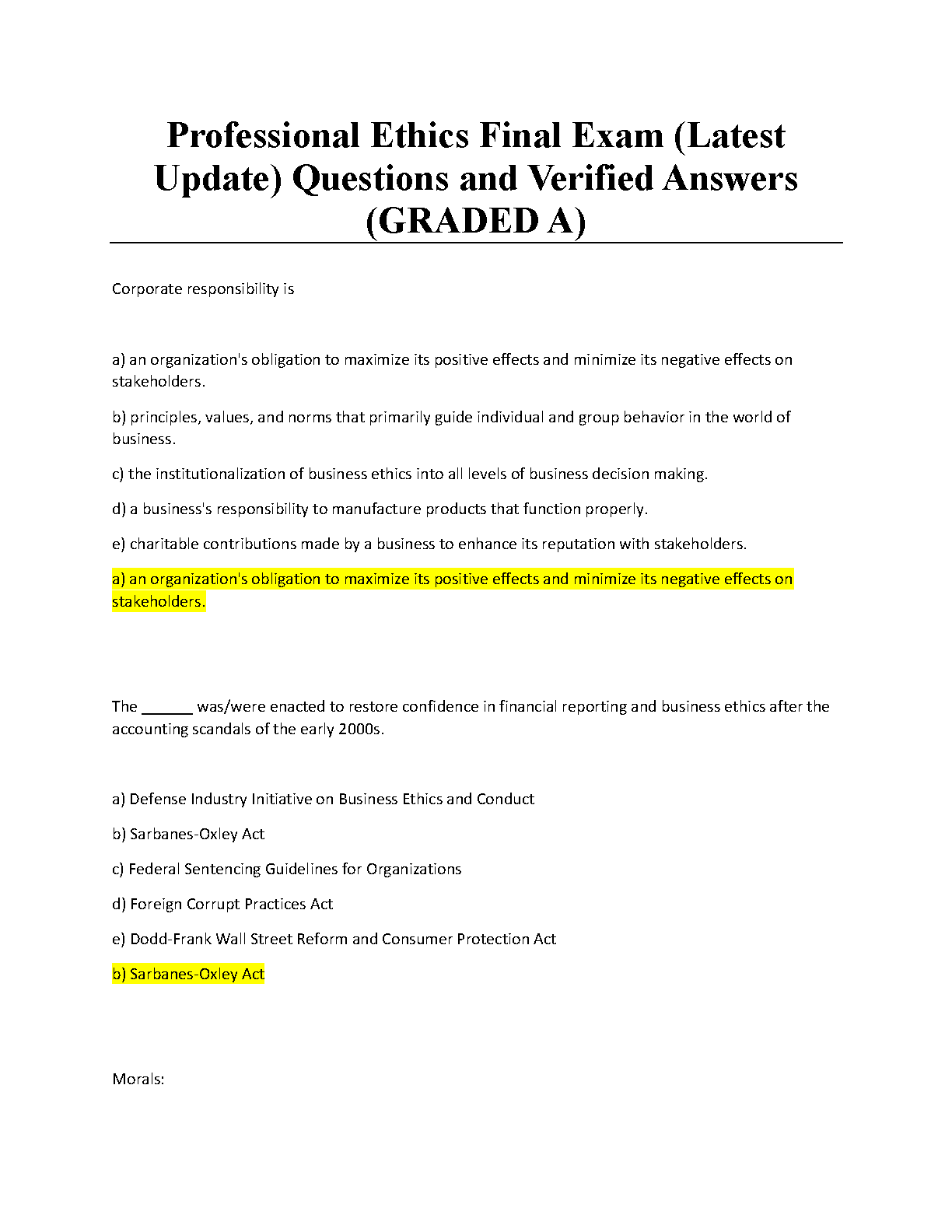 Professional Ethics Final Exam (Latest Update) Questions and Verified Answers (GRADED A) by Unknown Author