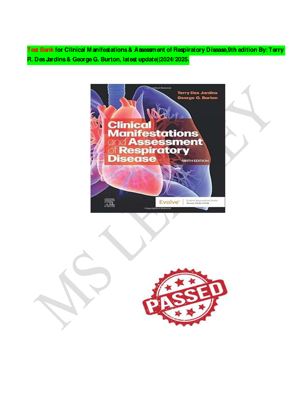 Test Bank for Clinical Manifestations and Assessment of Respiratory Disease, 9th Edition by Terry R. Des Jardins and George G. Burton - 2024/2025 Update