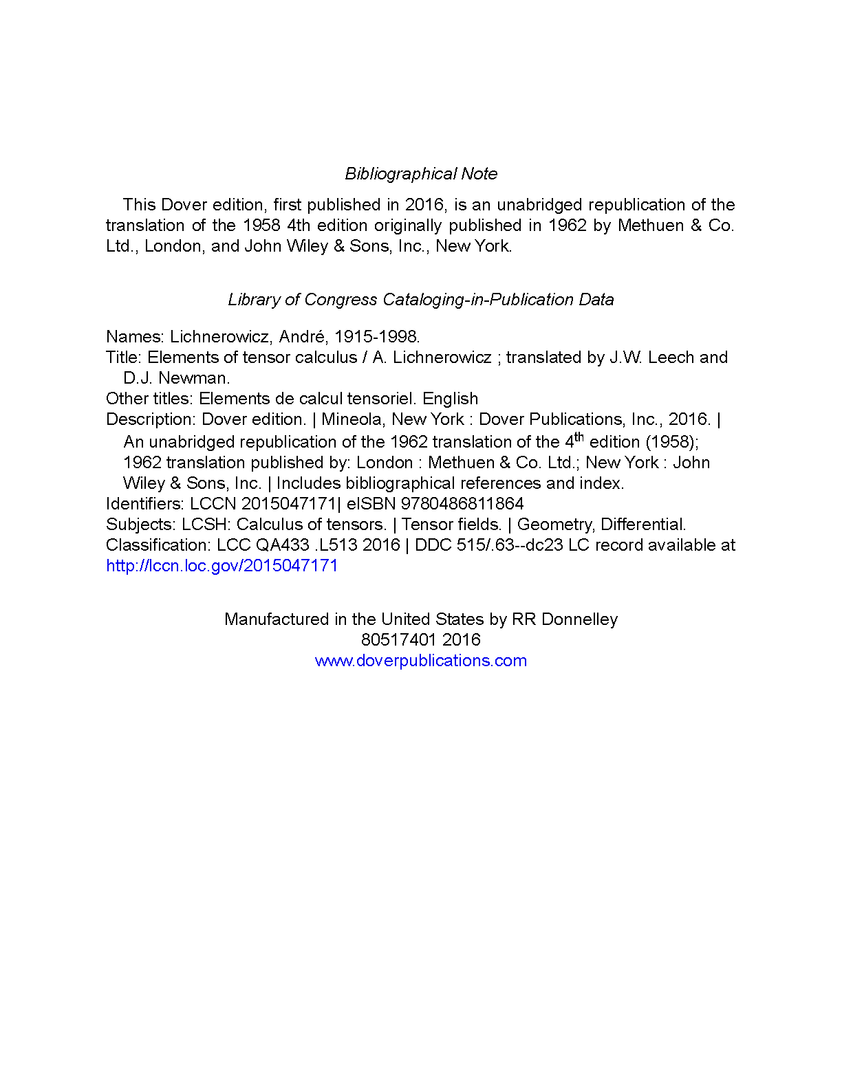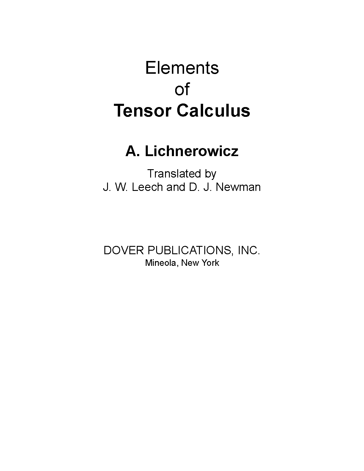 Elements of Tensor Calculus by A. Lichnerowicz, Translated by J.W. Leech and D.J. Newman