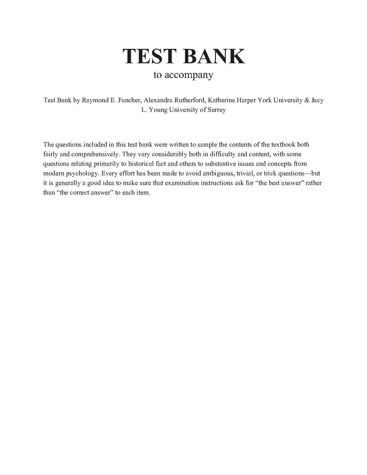 Test Bank to accompany Psychology by Raymond E. Fancher, Alexandra Rutherford, Katherine Harper, and Jacy L. Young