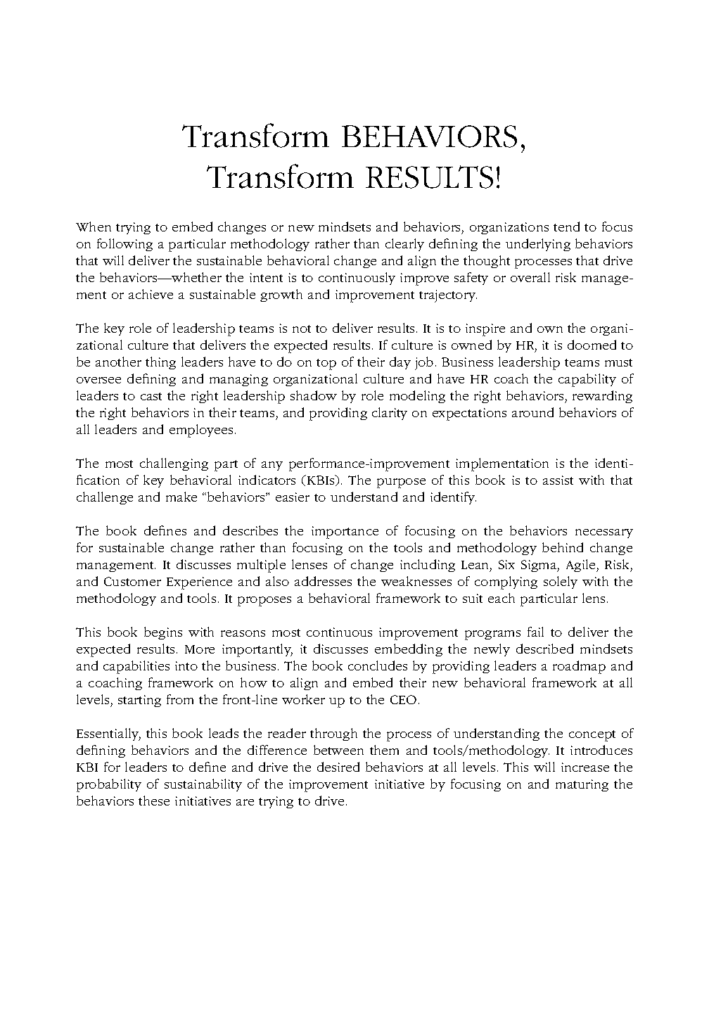 Unlock the secrets to driving sustainable change and improvement with "Transform Behaviors, Transform Results!" This comprehensive guide by Morgan L. Jones, Drew Butler, and Gerhard Plenert provides practical strategies for identifying and using behavioral indicators to achieve lasting results. Master the art of transforming behaviors and ultimately transforming results.
