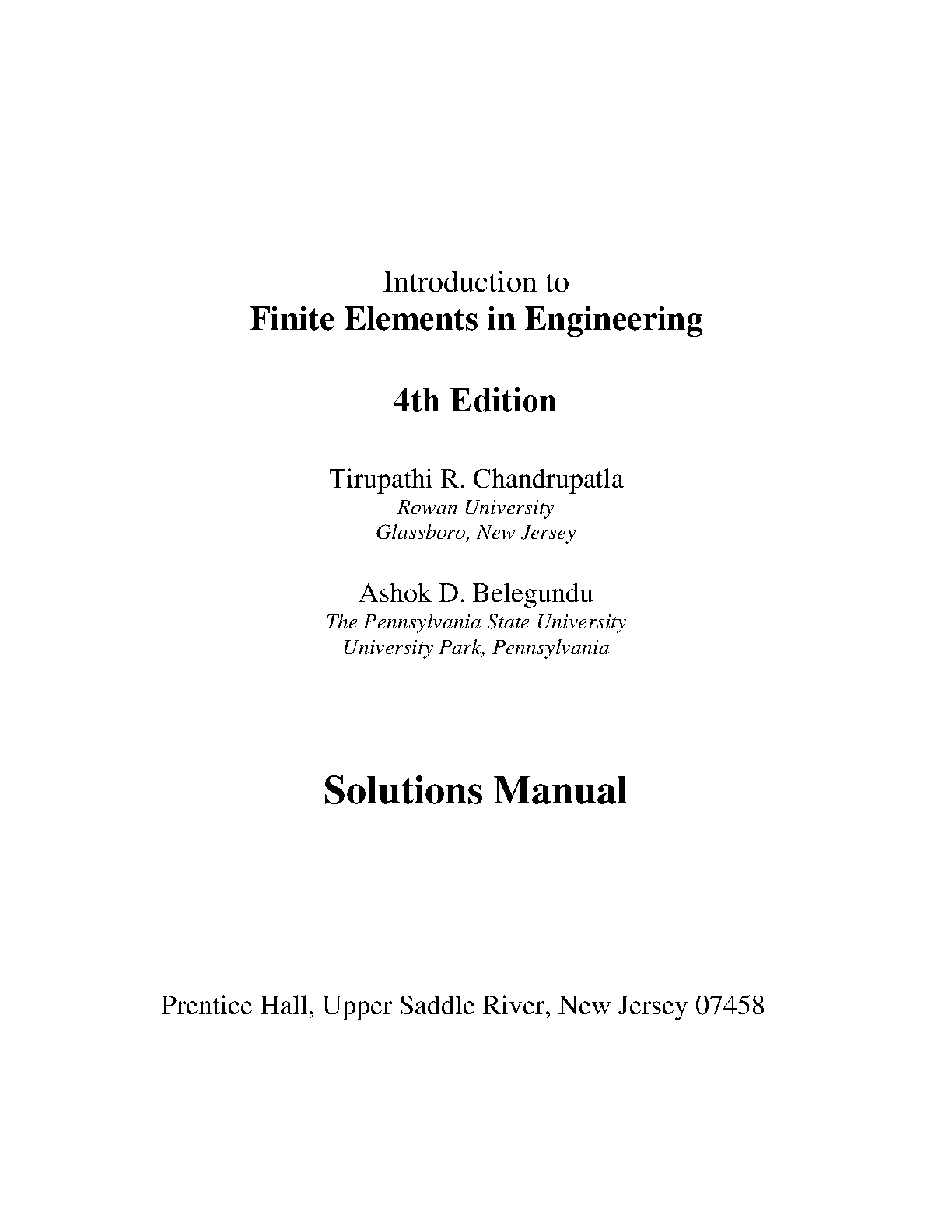 This comprehensive solutions manual accompanies the 4th edition of "Introduction to Finite Elements in Engineering" by Tirupathi R. Chandrupatla and Ashok D. Belegundu. It provides detailed solutions to all problems in the textbook, helping students master the concepts and excel in their engineering courses. Ace your exams on the first try with this essential resource.