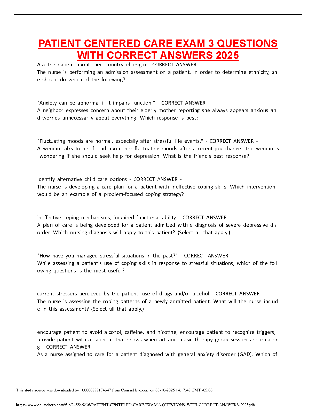 This resource provides a comprehensive set of patient-centered care exam questions with correct answers, ideal for nursing students preparing for their exams in 2024/2025. Designed to help students pass their exams on the first attempt and avoid resits.