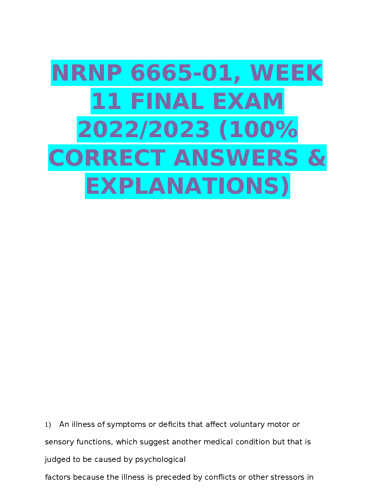 Ace your NRNP 6665-01 Week 11 Final Exam with this comprehensive guide featuring 100% correct answers and detailed explanations. Perfect for achieving exam success and avoiding resits. This resource covers the 2022/2023 material.