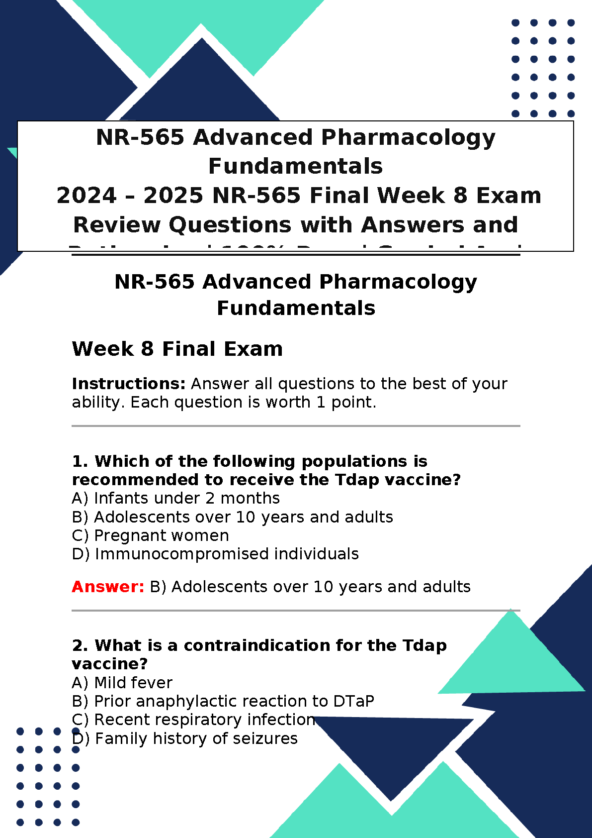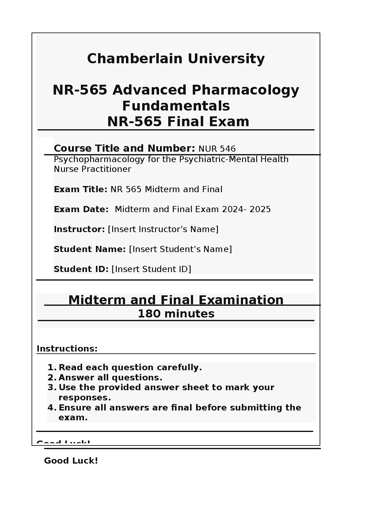 Prepare for success in Chamberlain University's NR-565 Advanced Pharmacology Fundamentals course with this comprehensive exam guide for the 2024-2025 academic year. Designed to help students master the material and pass their midterm and final exams with confidence, this resource provides in-depth explanations and practice questions. Avoid resits and achieve academic excellence.