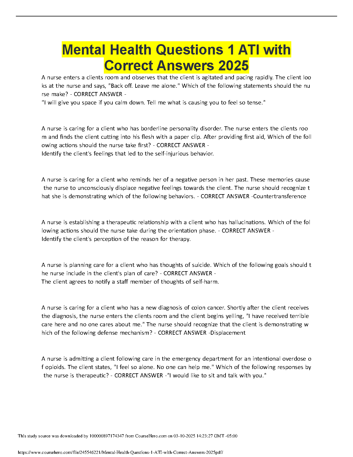 Mental Health Questions 1 ATI with Correct Answers 2025 by Unknown Author