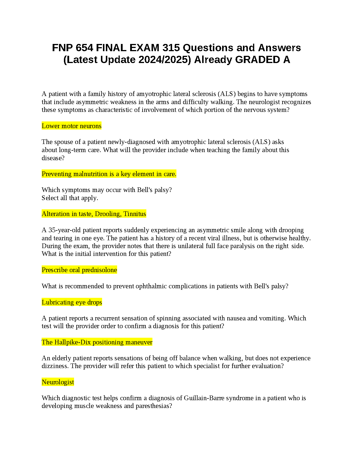 FNP 654 Final Exam: 315 Questions and Answers (2024/2025 Edition) - Guaranteed Exam Success