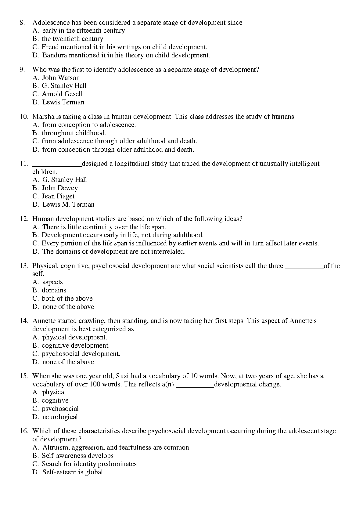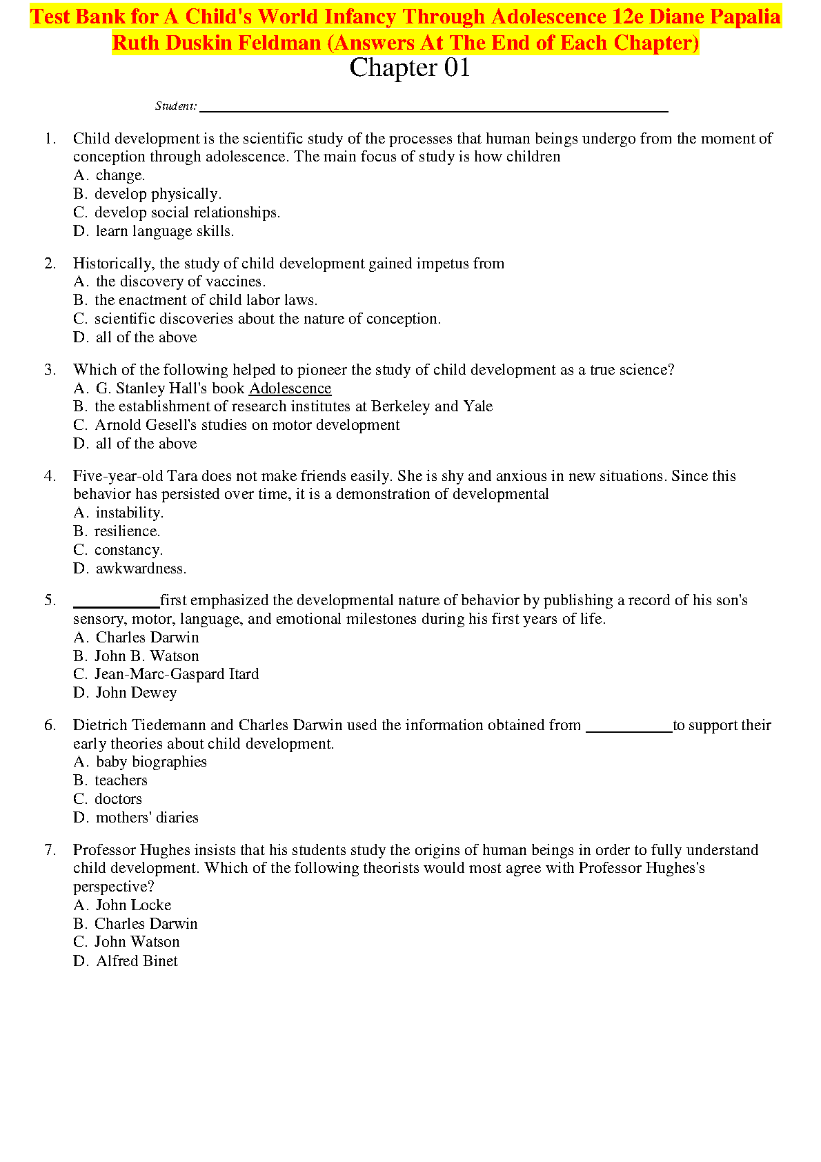 This comprehensive test bank accompanies the 12th edition of A Child's World: Infancy Through Adolescence by Diane Papalia and Ruth Duskin Feldman. It provides instructors with a wide range of questions to assess student understanding of key concepts in child development. Perfect for creating quizzes, exams, and homework assignments, this resource ensures thorough preparation and improved student outcomes.