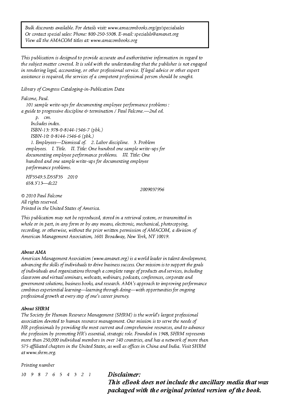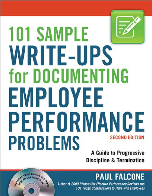 This comprehensive guide by Paul Falcone provides 101 sample write-ups for documenting employee performance issues. It offers a practical approach to progressive discipline and termination, helping managers effectively address performance problems. Includes easy-to-use templates for various situations. Ideal for HR professionals and managers seeking to improve employee performance management.
