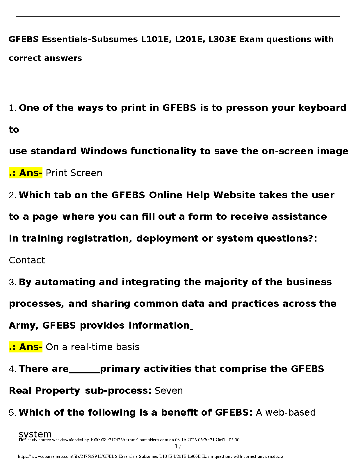 GFEBS Essentials-Subsumes L101E, L201E, L303E Exam Questions with Correct Answers