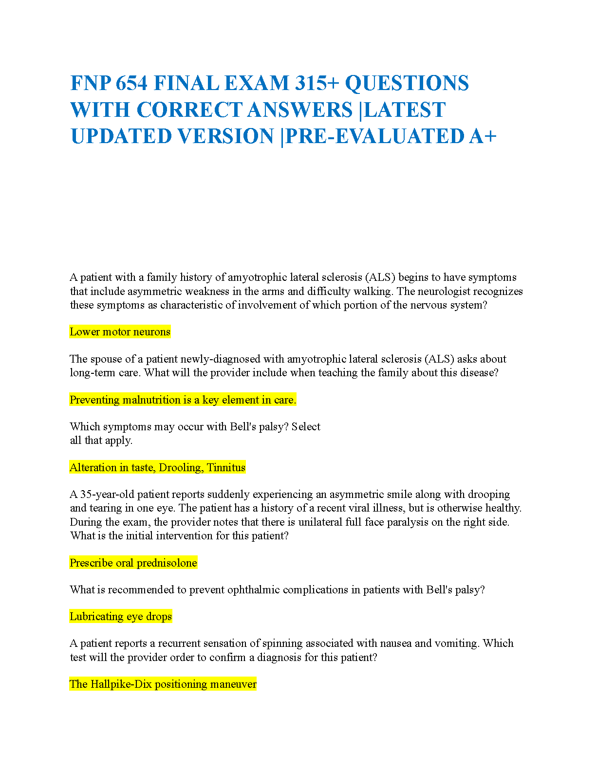 FNP 654 Final Exam 315+ Questions with Correct Answers (Latest Updated Version) by [Author Name]
