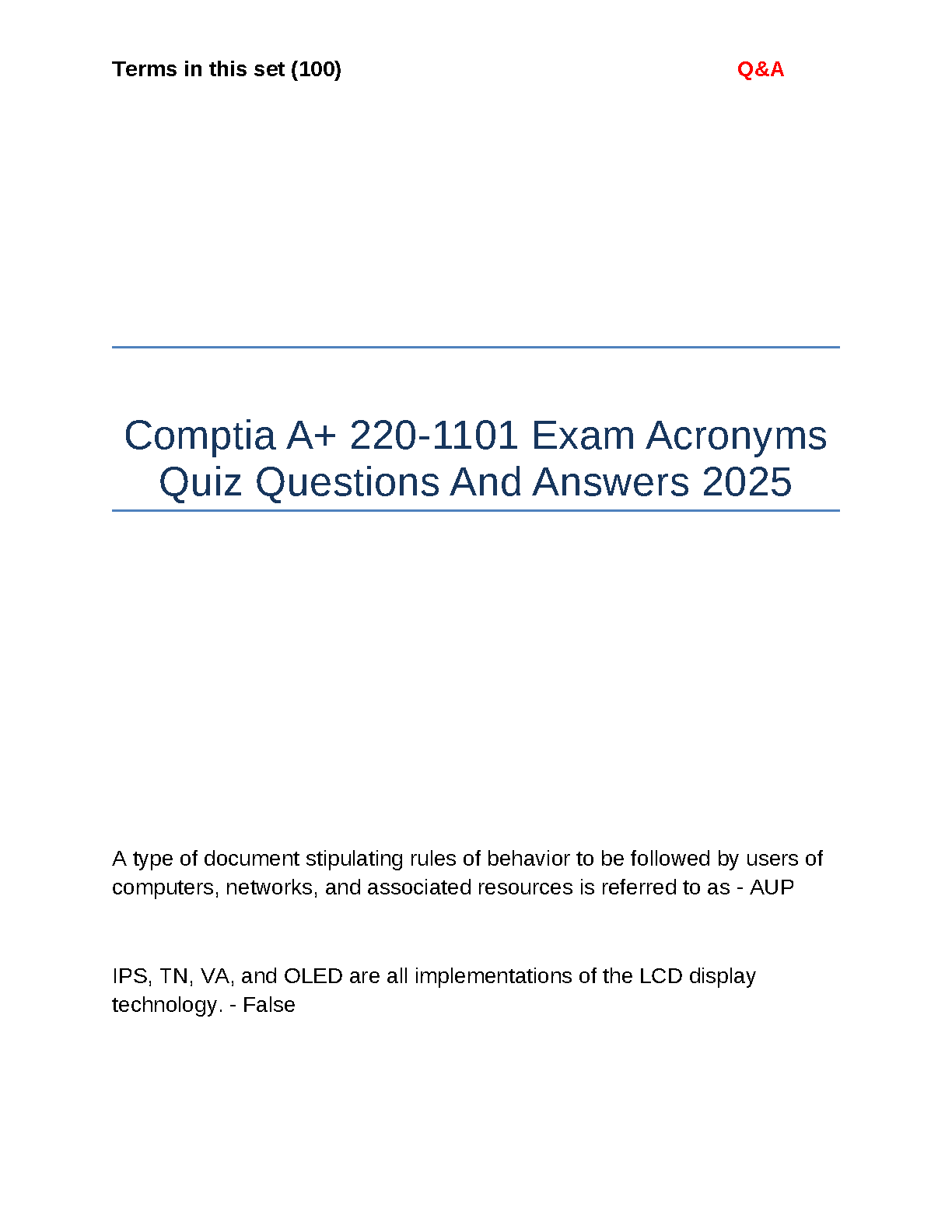 This comprehensive guide provides CompTIA A+ 220-1101 exam acronyms quiz questions and answers, designed to help students pass their exams on the first try. This study guide covers essential concepts and terminology, ensuring exam readiness for the 2024/2025 academic year.