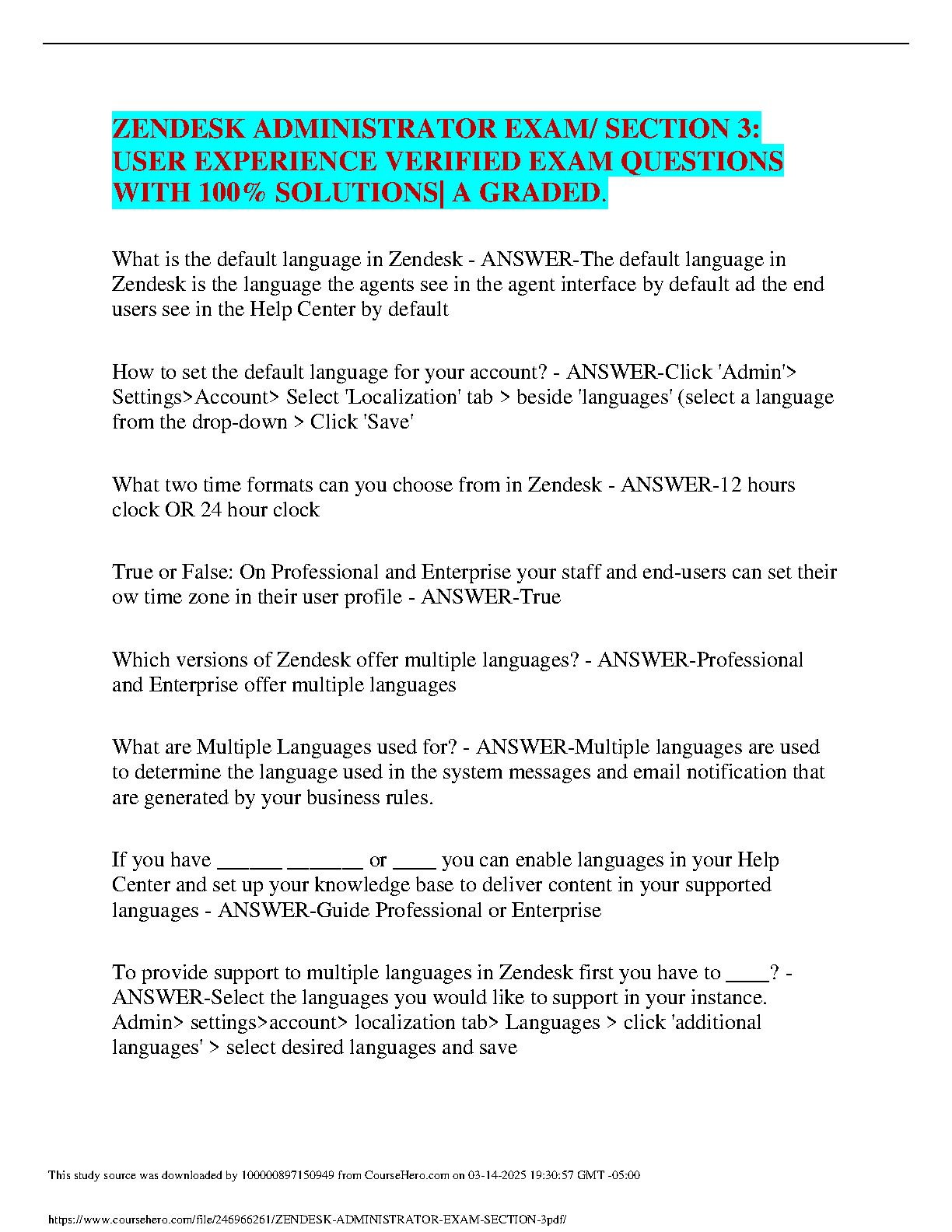 Ace your Zendesk Administrator Exam with this comprehensive guide. This resource provides 100% verified solutions to user experience exam questions, ensuring you pass on your first attempt. Get a graded understanding and avoid resits. Perfect for the 2024/2025 academic year.
