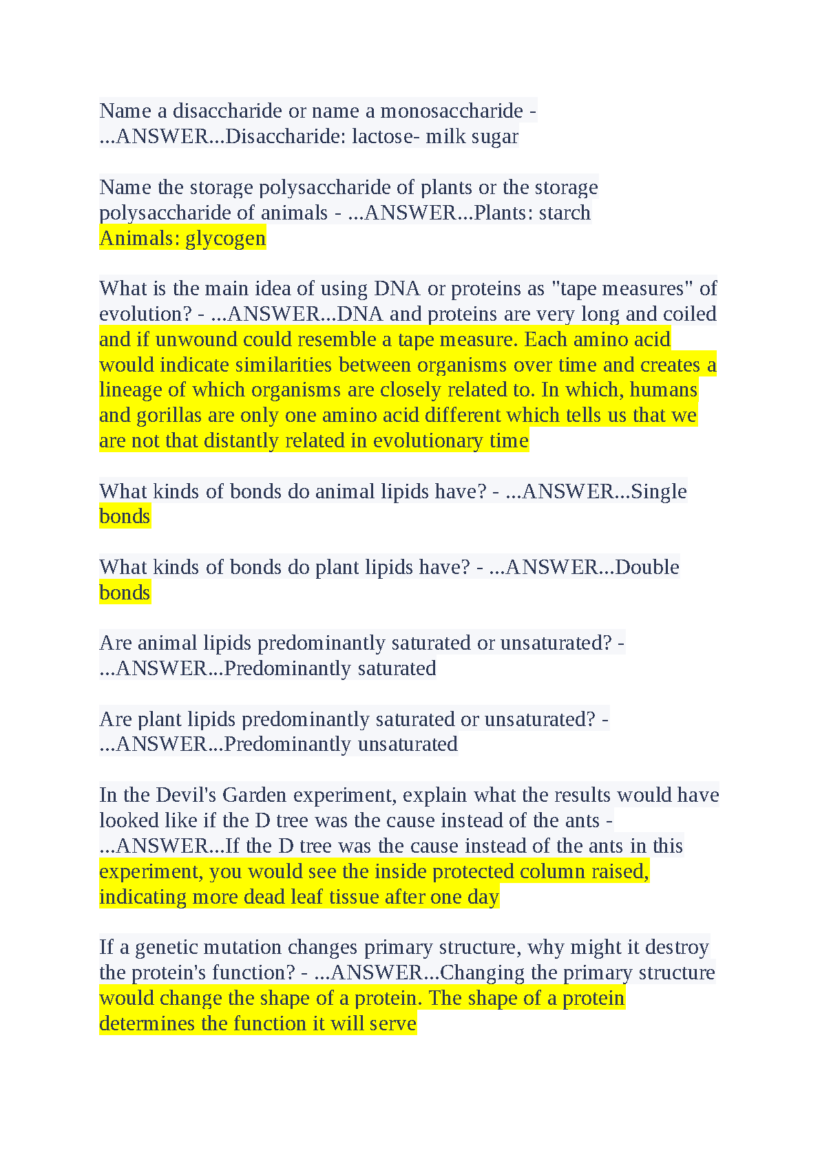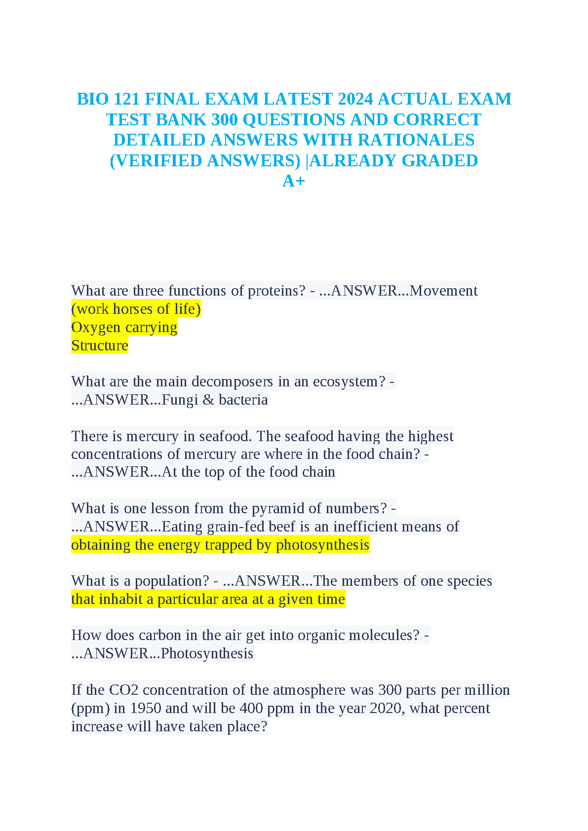 Ace your BIO 121 final exam with this comprehensive test bank featuring 300 questions, detailed answers, and rationales. This 2024-2025 edition ensures you're prepared for the latest exam format, helping you pass on your first attempt and avoid resits. All answers have been verified for accuracy.