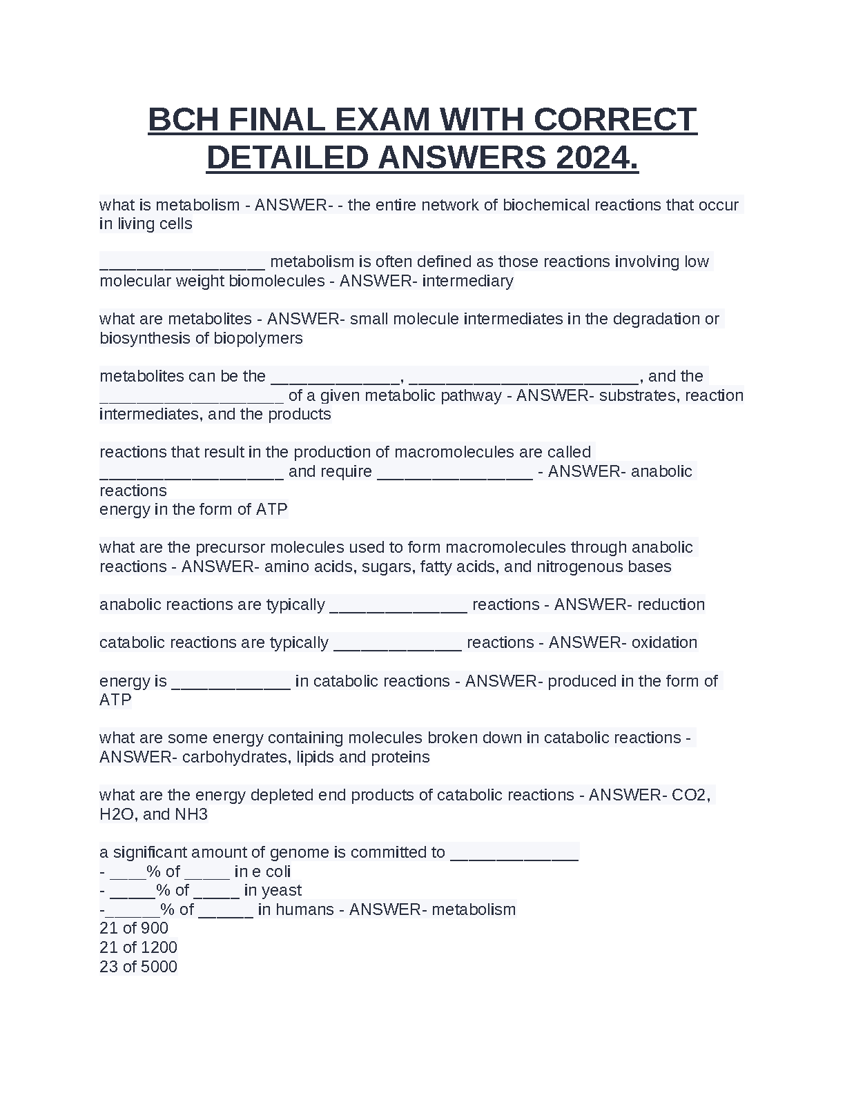 Ace your BCH final exam with this comprehensive study guide featuring detailed answers to key questions. Perfect for first-time exam takers aiming for success and avoiding resits. Covers metabolism, anabolic and catabolic reactions, and more.