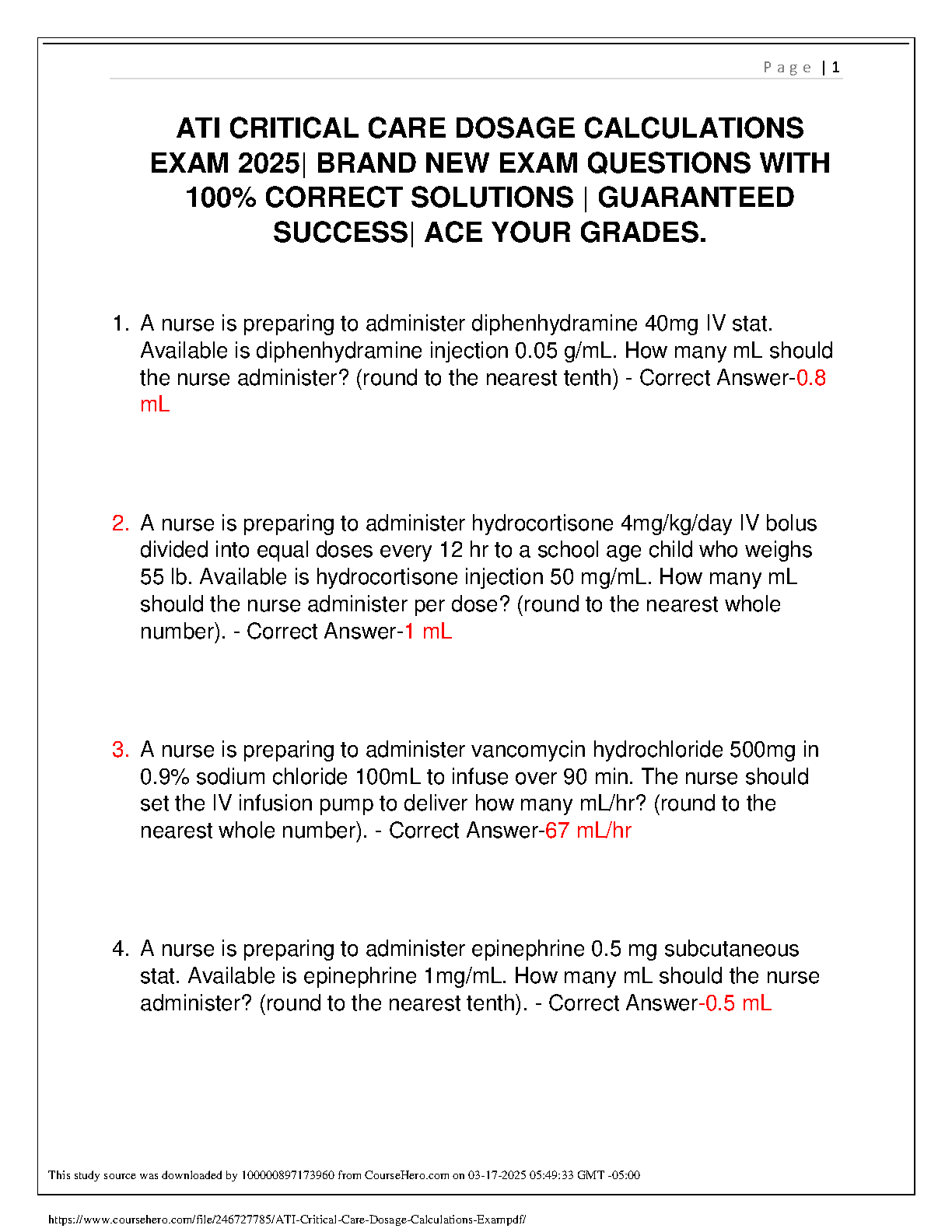 Ace your ATI Critical Care Dosage Calculations Exam in 2025 with this comprehensive guide. This resource contains brand new exam questions and 100% accurate solutions, guaranteeing exam success and helping you avoid resits. Prepare effectively and confidently for your exam.