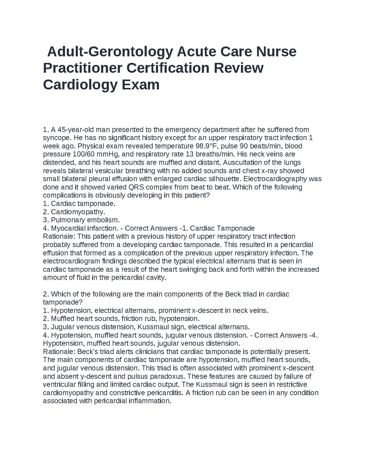 Ace your Adult-Gerontology Acute Care Nurse Practitioner Certification exam on your first try with this expertly crafted 2024/2025 study guide. This resource is designed to help you master the cardiology section, boosting your confidence and ensuring exam success. Prepare effectively and avoid resits!
