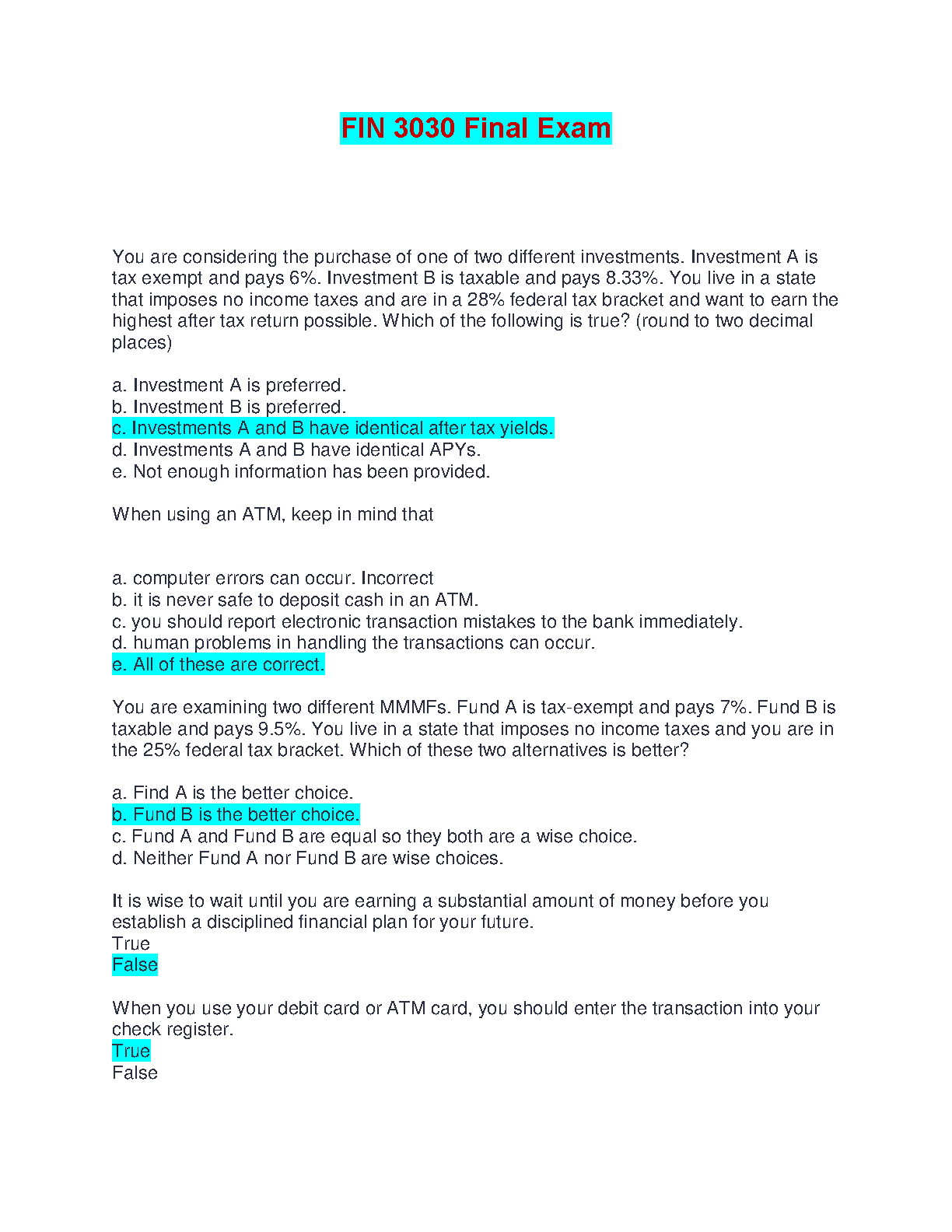 This resource is designed to help students excel in their FIN 3030 final exam. It offers a complete guide with practice questions and solutions, enabling them to master the concepts and achieve success on their first attempt, thus preventing resits. This 2024/2025 edition includes updated content and is perfect for students aiming for high grades.
