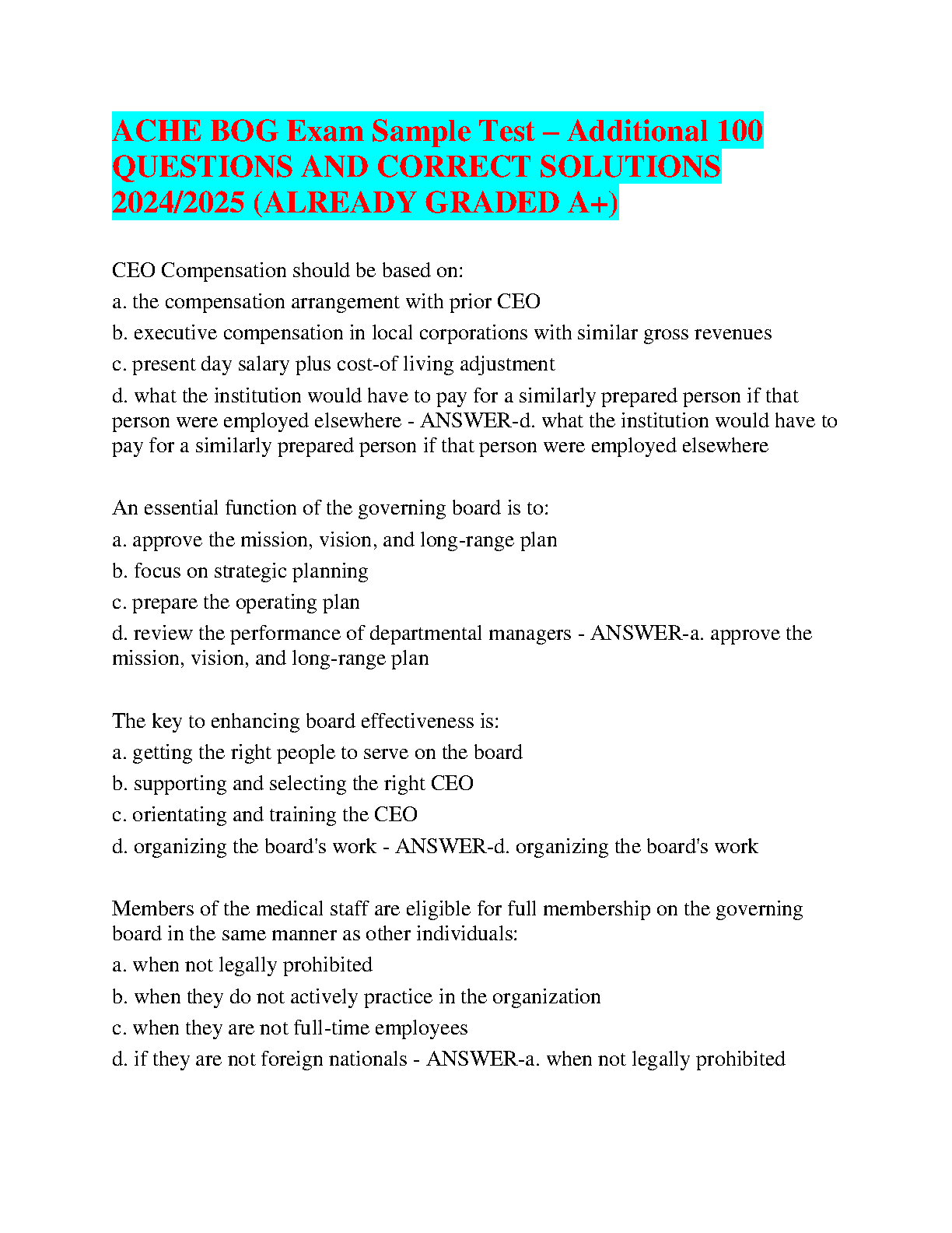 ACHE BOG Exam Sample Test - Additional 100 Questions and Correct Solutions 2024/2025 (Already Graded A+) by Unknown Author