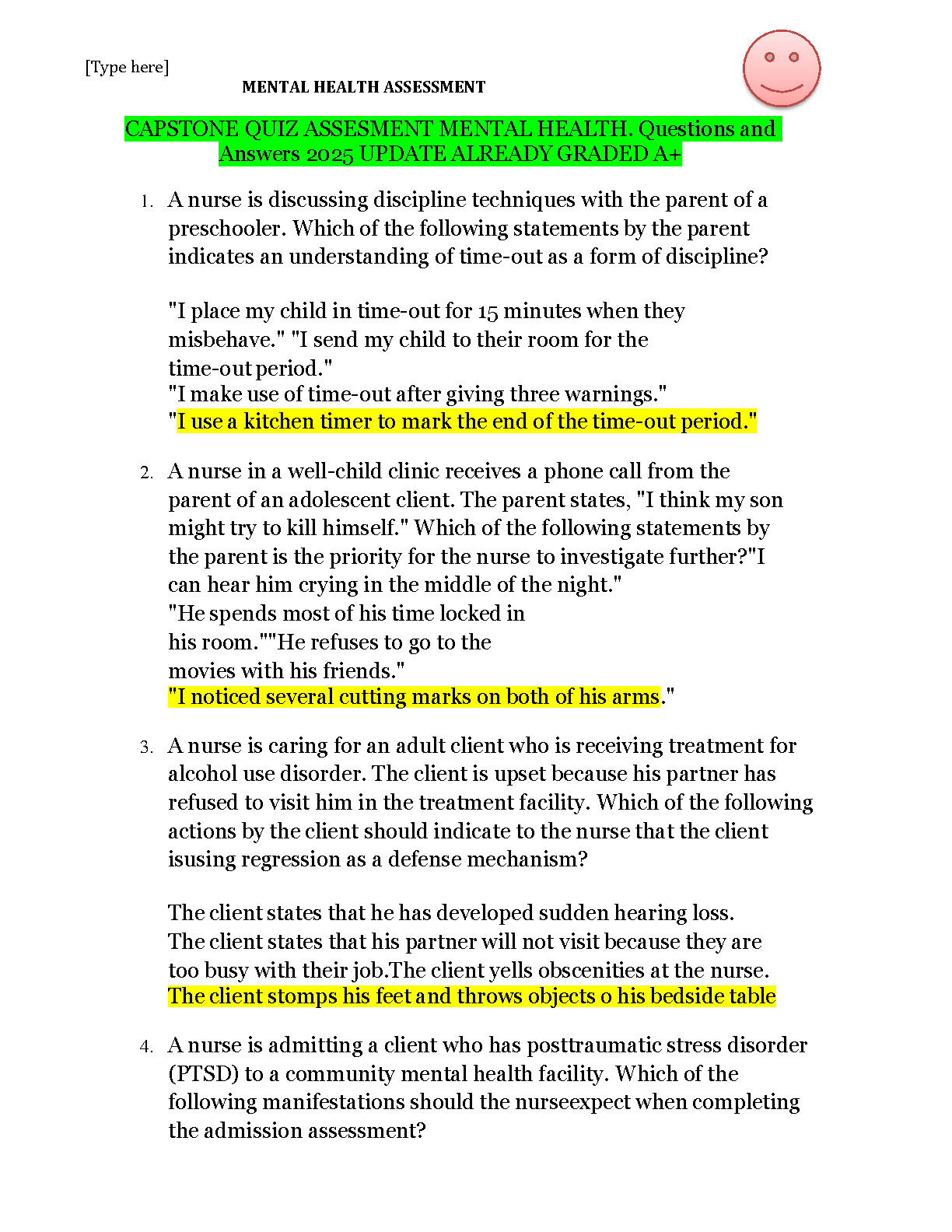 Capstone Quiz Assessment Mental Health: Questions and Answers 2025 Edition by [Author Names - If not found, replace with "Various Authors"]