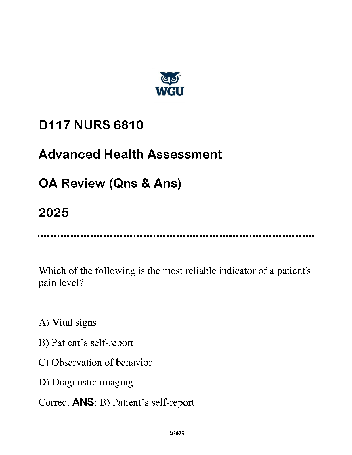 WGU D117 NURS 6810 Advanced Health Assessment OA Review 2025: Questions and Answers