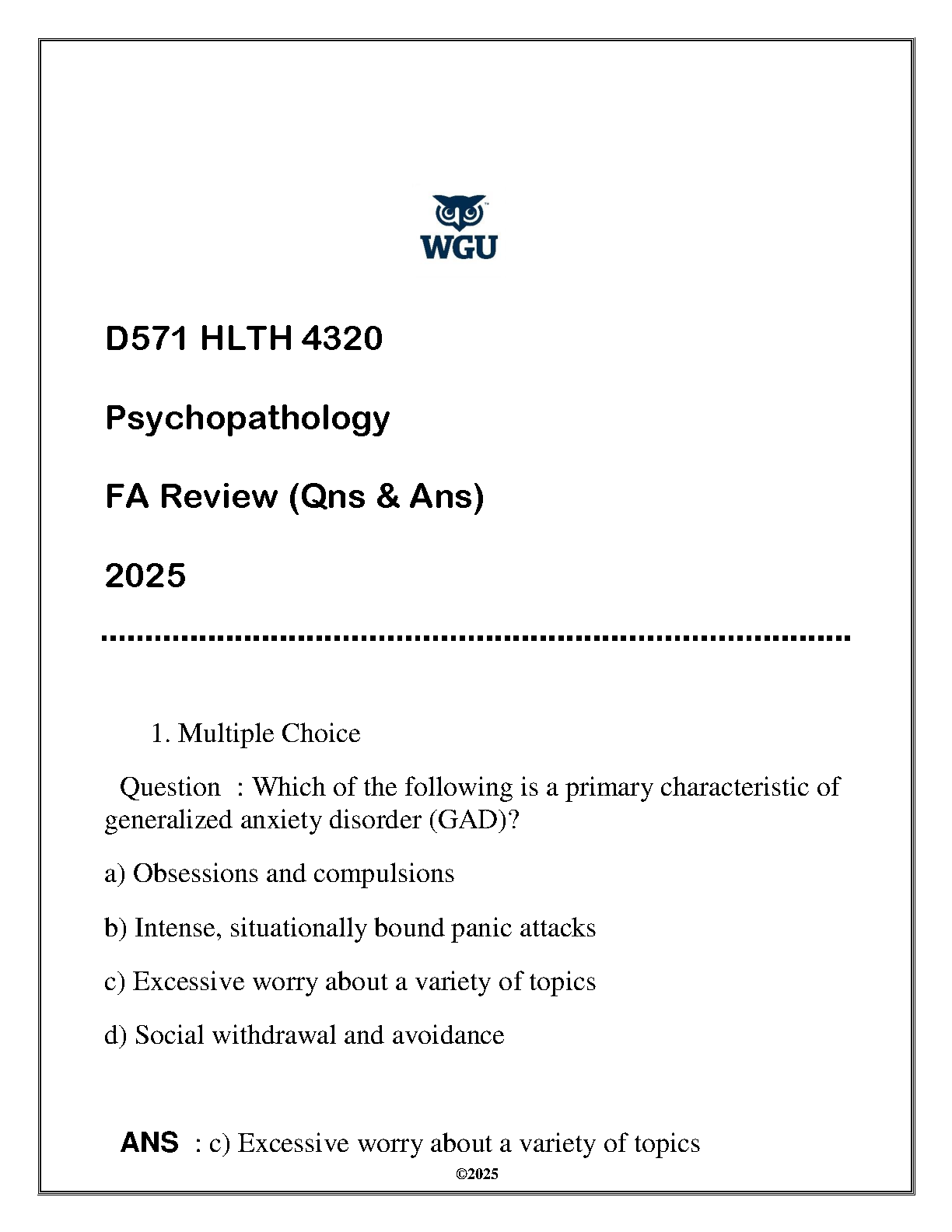 Ace your WGU D571 HLTH 4320 Psychopathology exam with this comprehensive 2025 edition FA Review. This resource provides a thorough collection of questions and answers, ensuring you master the key concepts and pass on your first attempt. Avoid resits and achieve academic success.