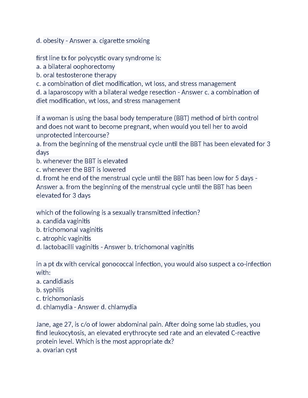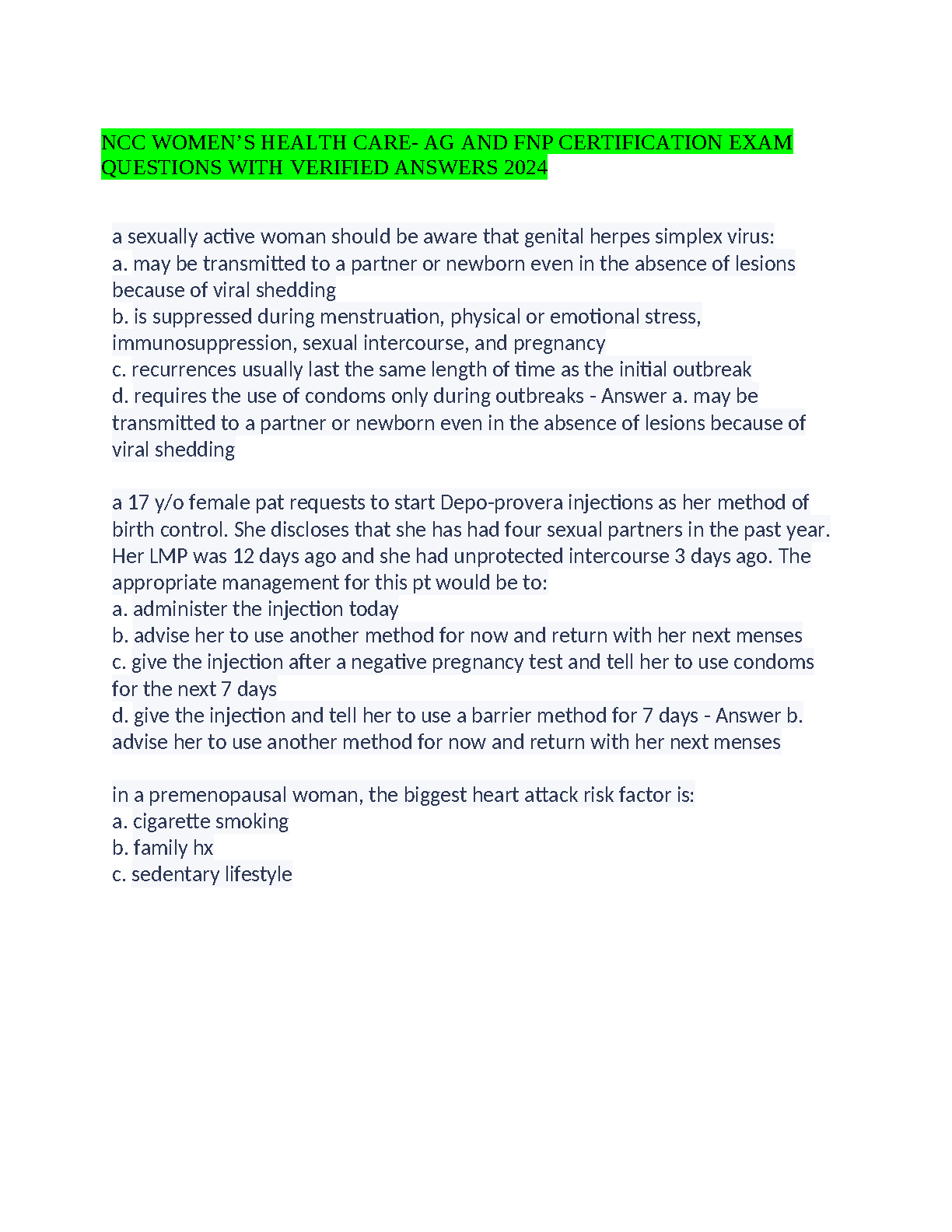 Prepare for the NCC Women's Health Care Certification Exam with this comprehensive question bank featuring verified answers for the 2024 exam. Ace your exam on the first try and avoid resits with this essential study resource.