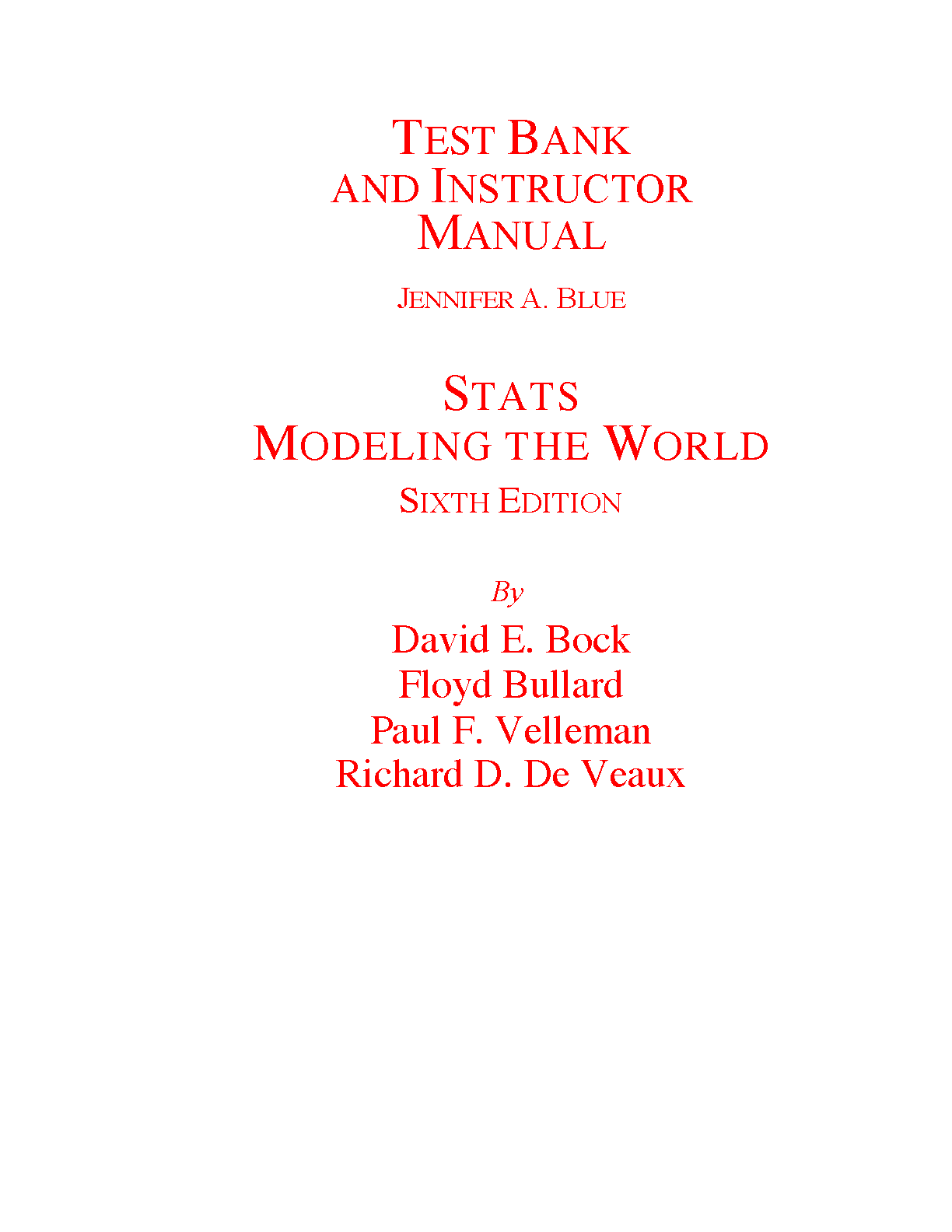 Stats Modeling the World Sixth Edition Test Bank and Instructor Manual by David E. Bock, Floyd Bullard, Paul F. Velleman, Richard D. De Veaux and Jennifer A. Blue