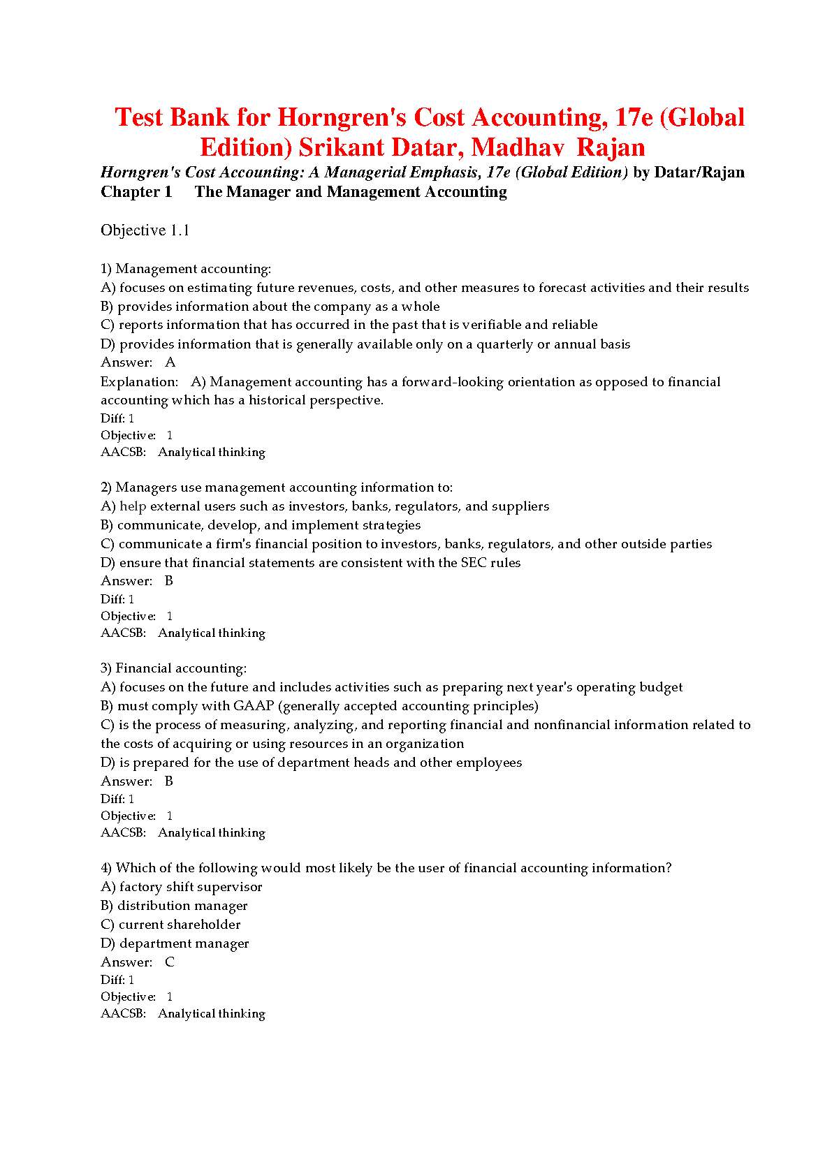 Horngren's Cost Accounting 17e (Global Edition) Test Bank by Srikant Datar and Madhav Rajan