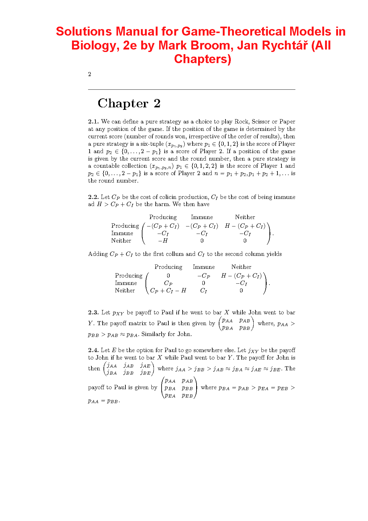 Solutions Manual for Game-Theoretical Models in Biology, 2nd Edition by Mark Broom and Jan Rychtář