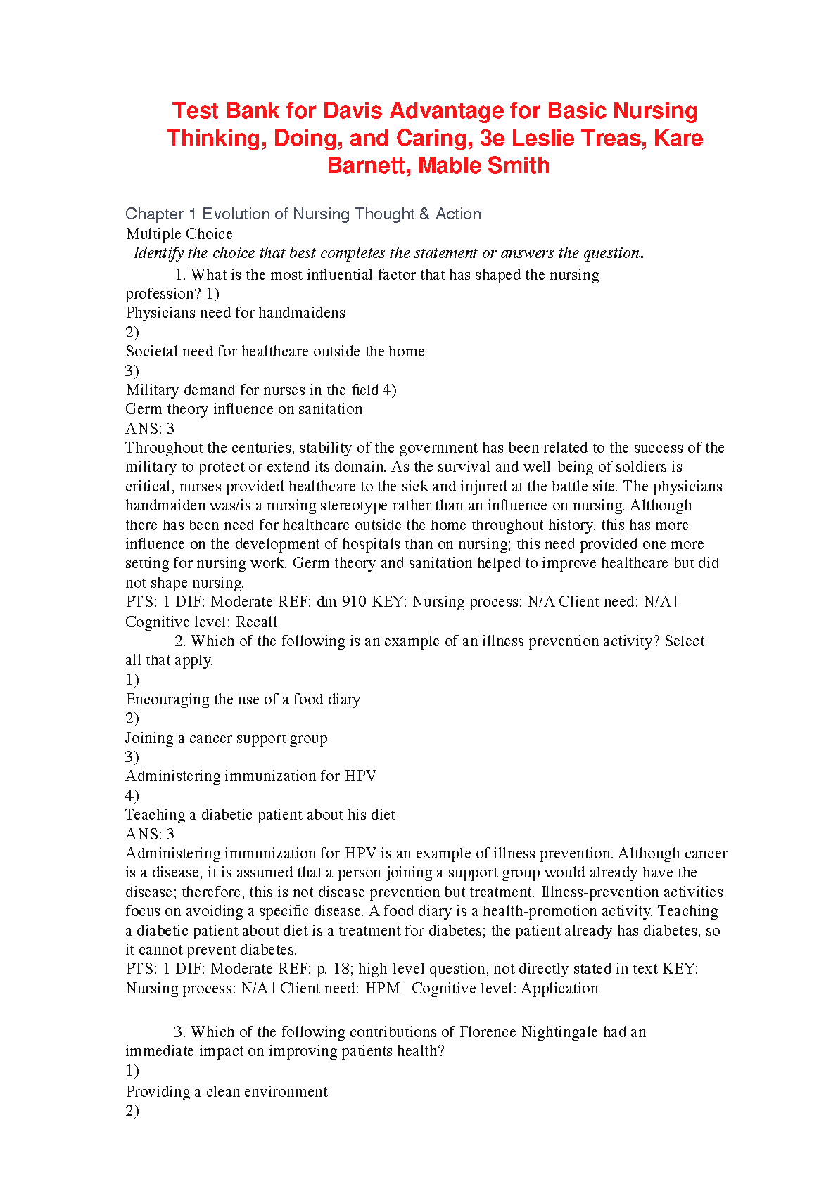 Davis Advantage for Basic Nursing: Thinking, Doing, and Caring, 3e Test Bank by Leslie Treas, Kare Barnett, and Mable Smith