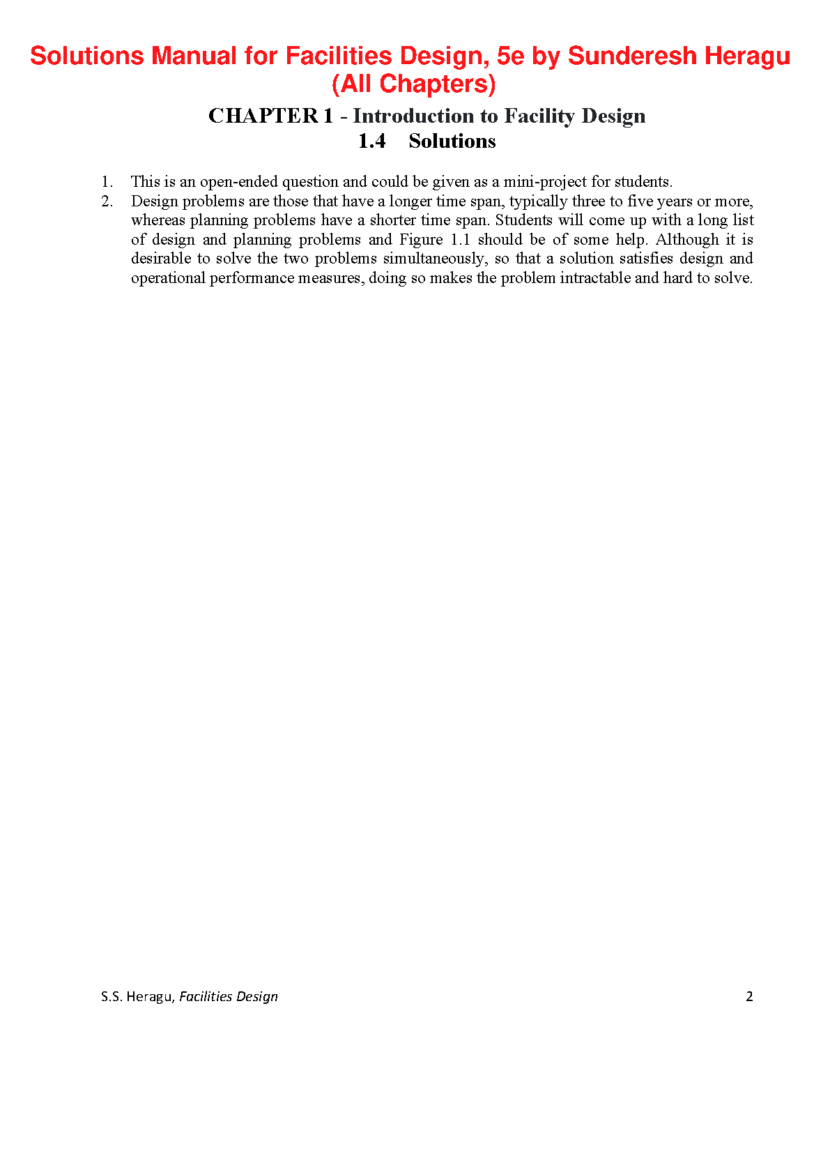 Access the comprehensive solutions manual for Facilities Design, 5th Edition, by Sunderesh Heragu. This resource provides detailed solutions to all chapter exercises, helping students master key concepts and achieve exam success on their first attempt.