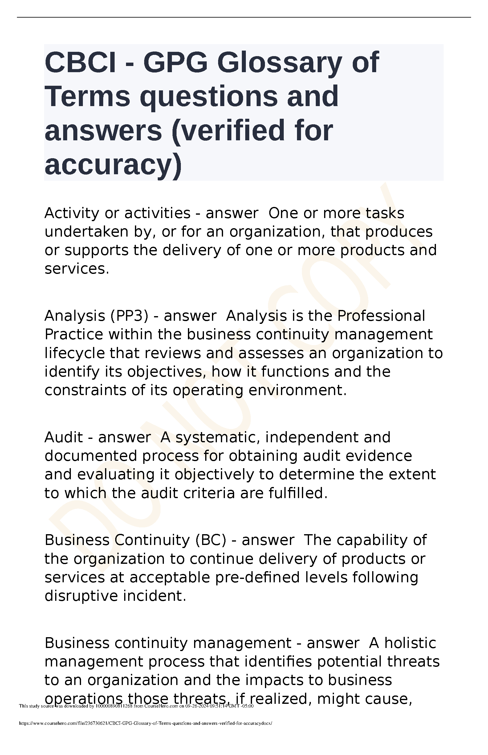 This comprehensive glossary provides verified answers to questions about CBCI and GPG, covering key concepts like activity analysis, business continuity, and management. Ideal for students aiming for exam success on their first attempt.