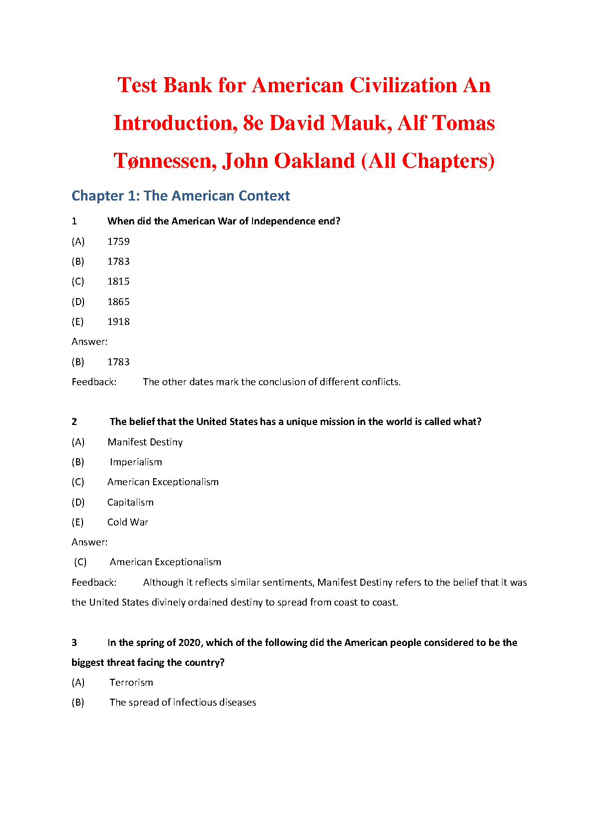 Test Bank for American Civilization An Introduction, 8th Edition by David Mauk, Alf Tomas Tonnessen, and John Oakland