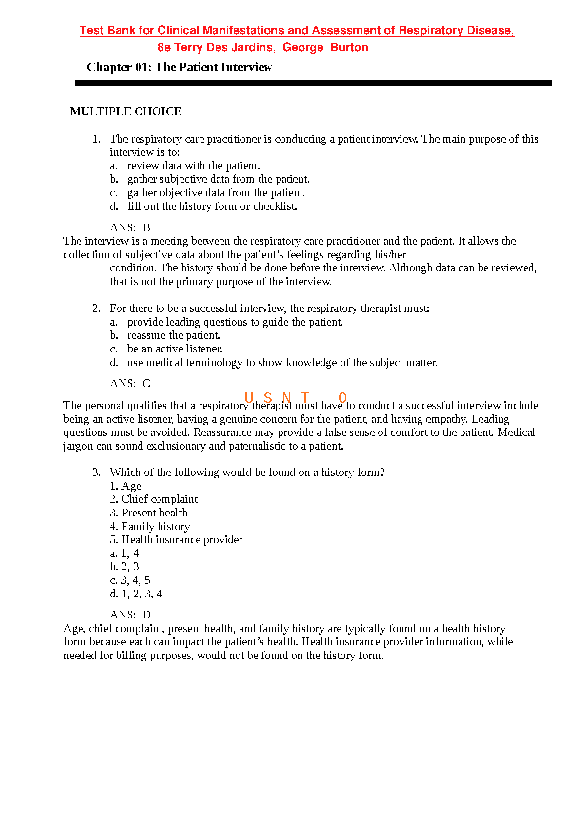 Ace your Respiratory Therapy exams with this comprehensive test bank for Clinical Manifestations and Assessment of Respiratory Disease, 8th edition by Terry Des Jardins and George Burton. This resource is designed to help students master the material and pass their exams on the first attempt, eliminating the need for resits.