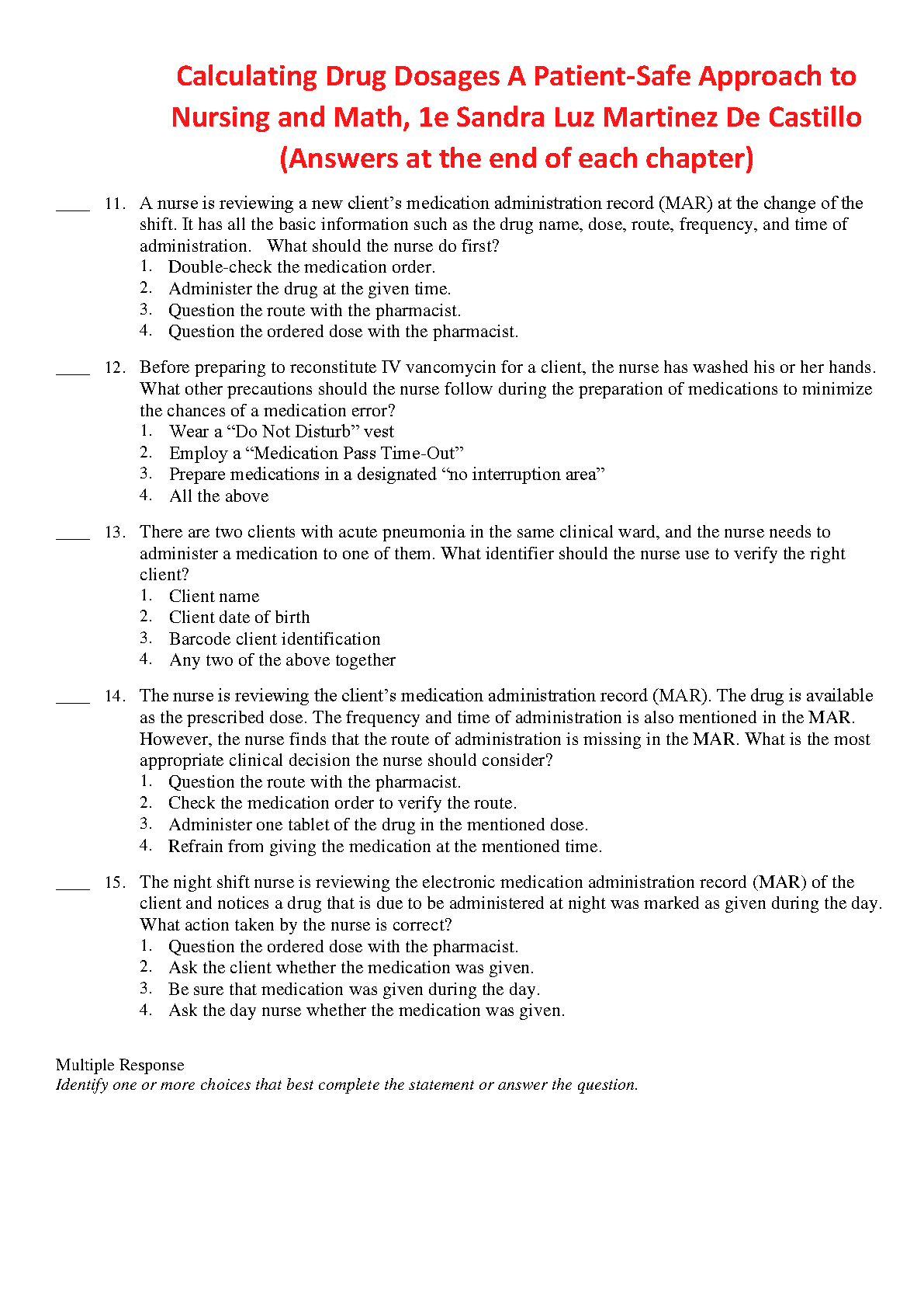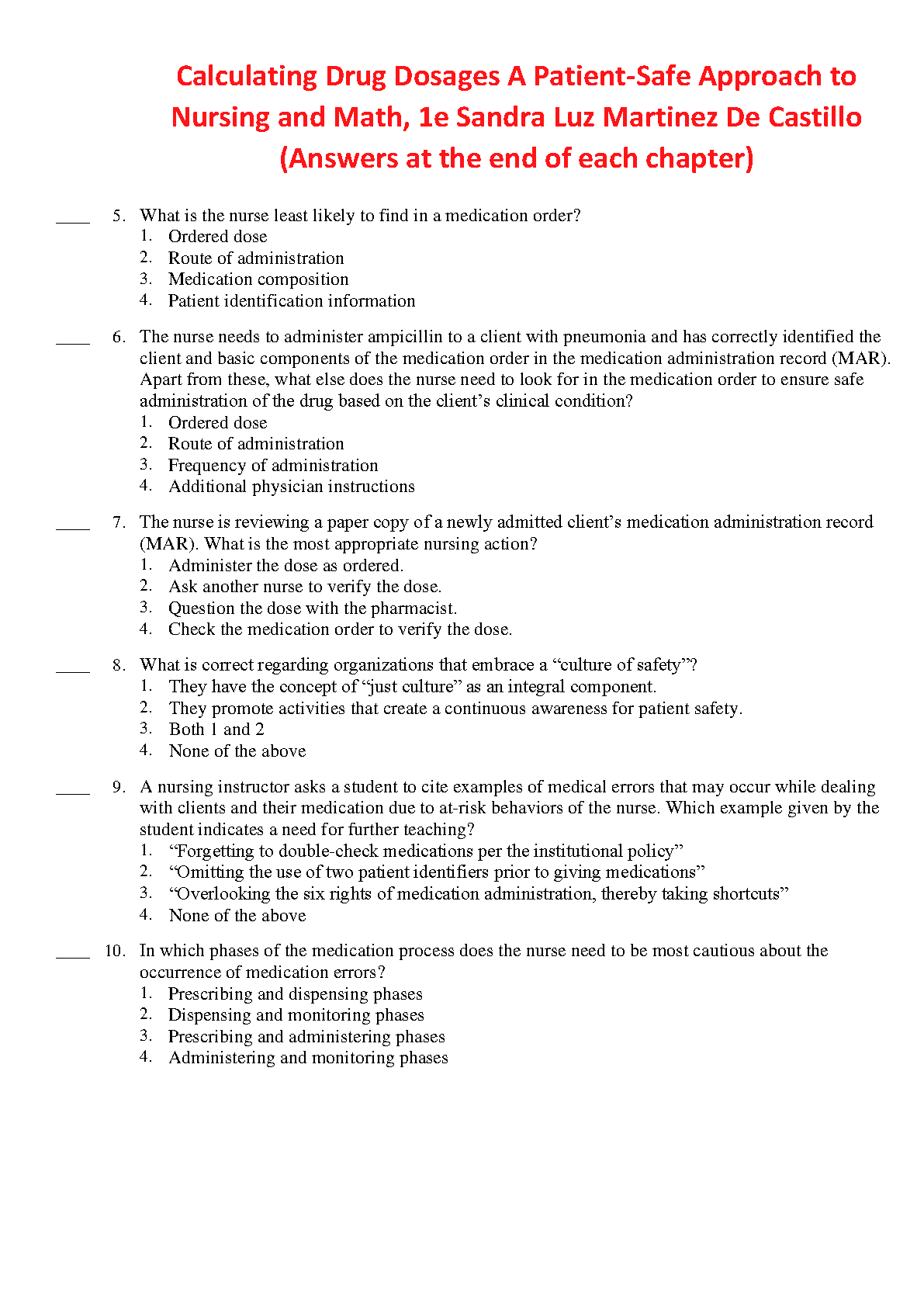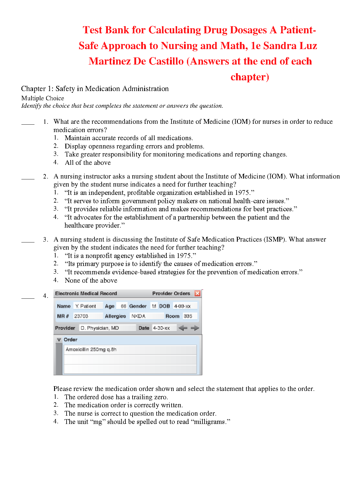 Test Bank for Calculating Drug Dosages: A Patient-Safe Approach to Nursing and Math, 1st Edition, by Sandra Luz Martinez De Castillo