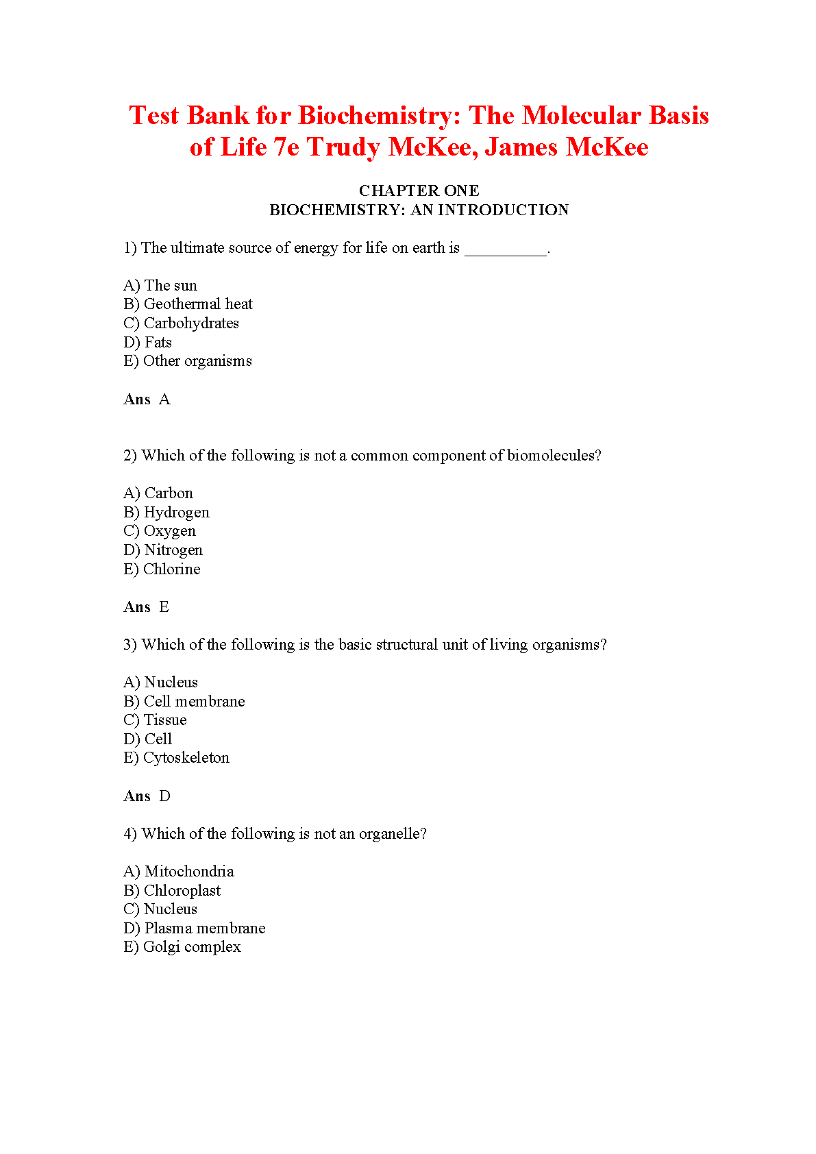 Biochemistry: The Molecular Basis of Life 7th Edition Test Bank - Trudy McKee and James McKee