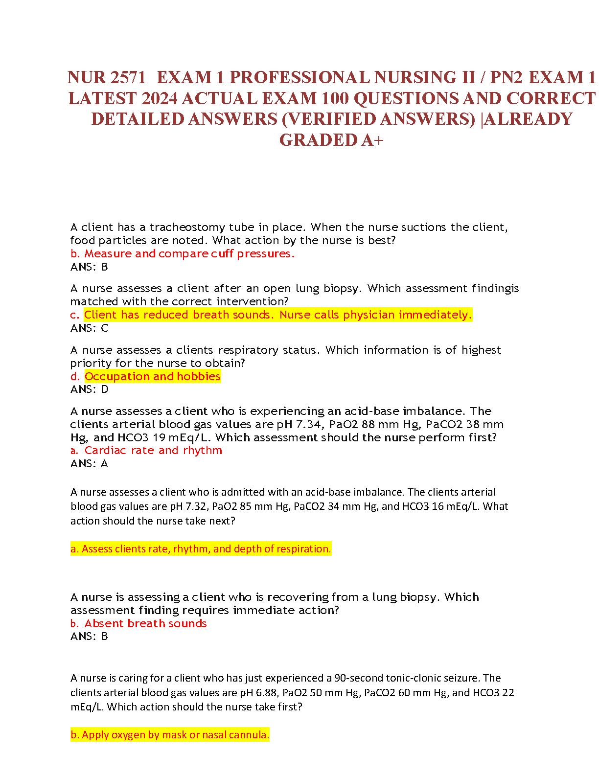 NUR 2571 Exam 1 Professional Nursing II/PN2 Exam 1: Latest 2024 Actual Exam 100 Questions and Correct Detailed Answers by [Author Names not found]
