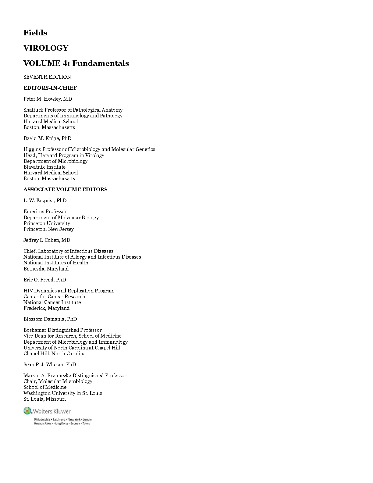 Fields Virology, Volume 4: Fundamentals, Seventh Edition, by Peter M. Howley, David M. Knipe, L.W. Enquist, Jeffrey I. Cohen, Eric O. Freed, Blossom A. Damania, and Sean P.J. Whelan