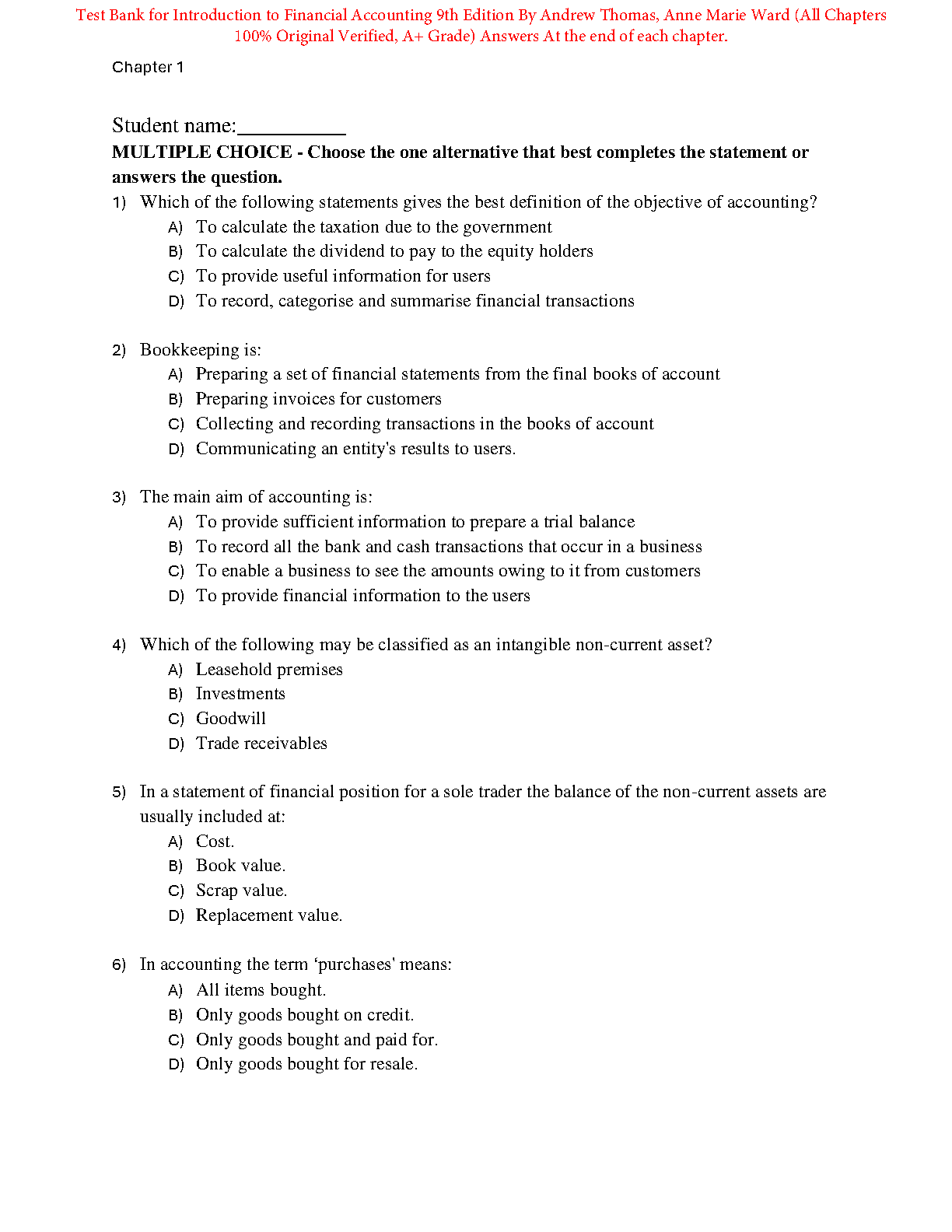 Ace your Introduction to Financial Accounting exams with this comprehensive 9th edition test bank by Andrew Thomas and Anne Marie Ward. This resource provides detailed answers and explanations, helping you master key concepts and achieve exam success on your first attempt.