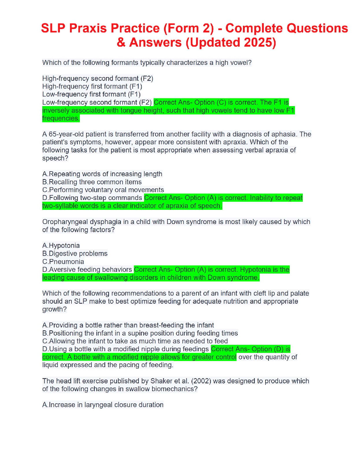 SLP Praxis Practice Exam: Complete Questions & Answers (Updated 2025) by Unknown Author