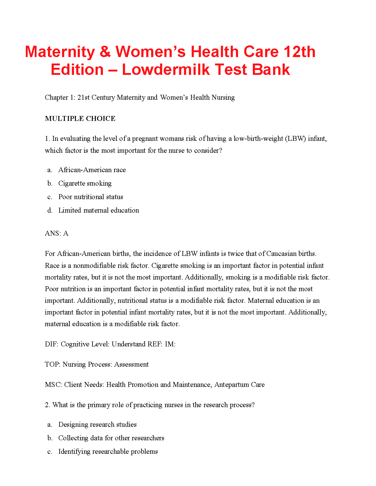 Ace your exams with this comprehensive test bank for Lowdermilk, Perry, and Alden's Maternity & Women's Health Care, 12th Edition. This resource provides in-depth practice questions and answers, covering all key concepts to help students master the material and succeed on their first attempt.