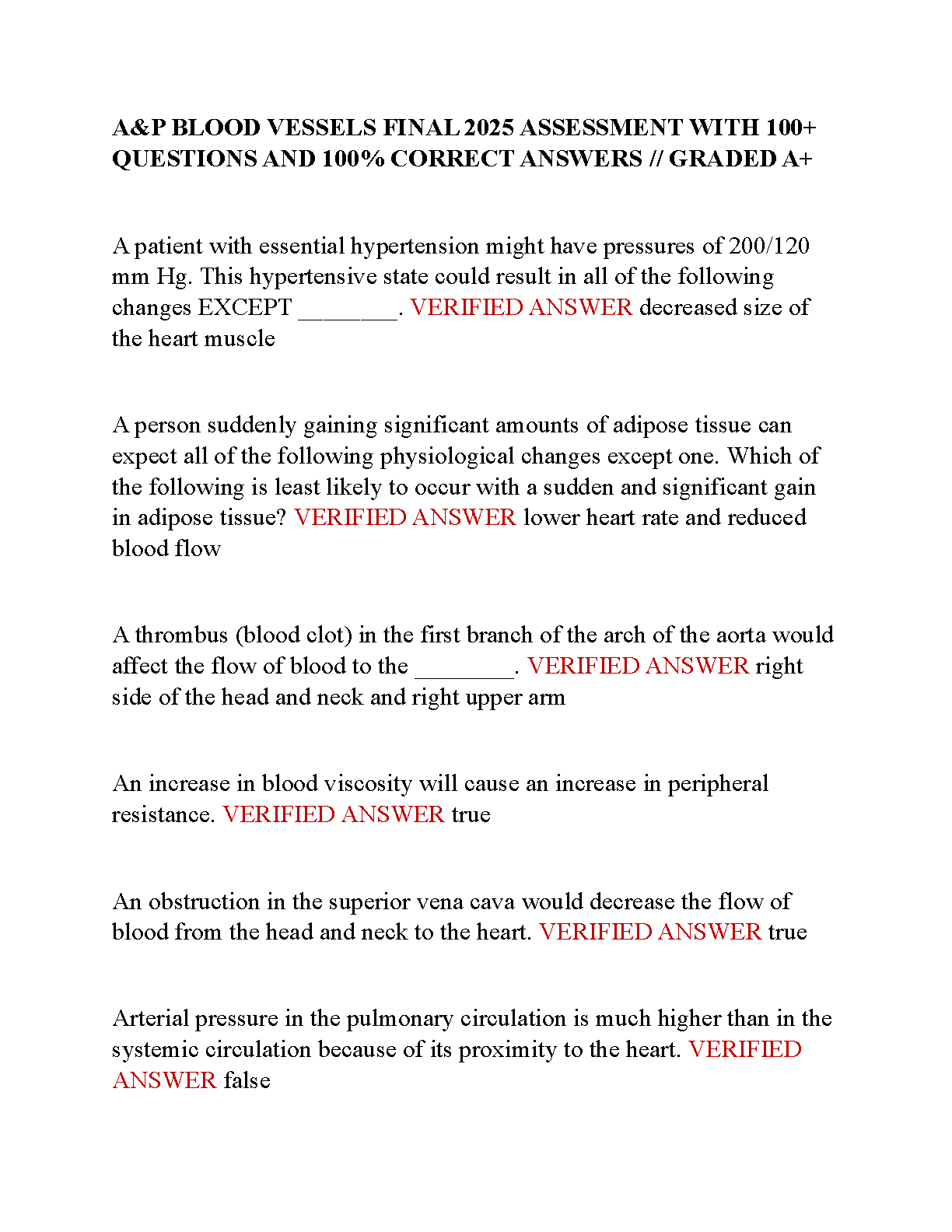 Ace your A&P Blood Vessels final exam with this comprehensive assessment! This resource includes 100+ questions and answers, all verified for accuracy, to help you achieve an A+ and avoid resits. Prepare effectively for the 2024/2025 academic year.
