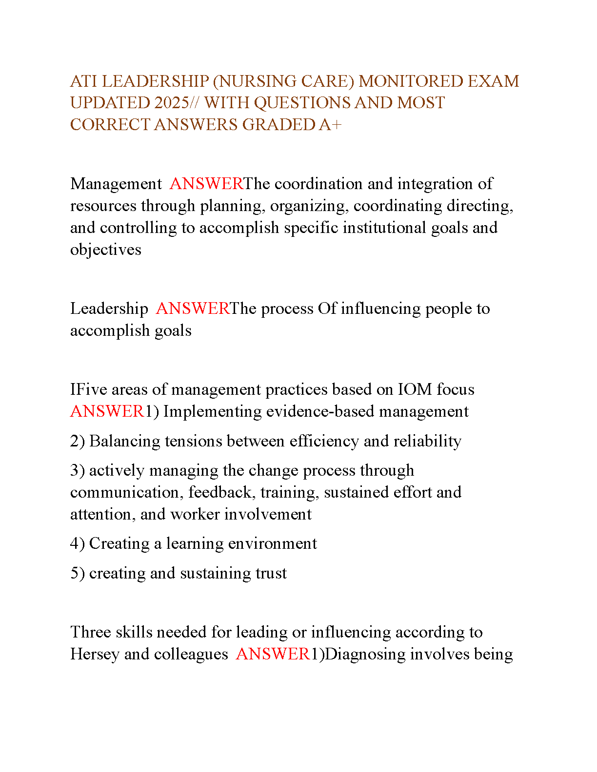 Ace your ATI Leadership (Nursing Care) Monitored Exam with this updated 2025 edition. This resource provides comprehensive questions and answers, all graded A+, ensuring you're fully prepared for exam success on your first attempt. Avoid resits and master the material efficiently.