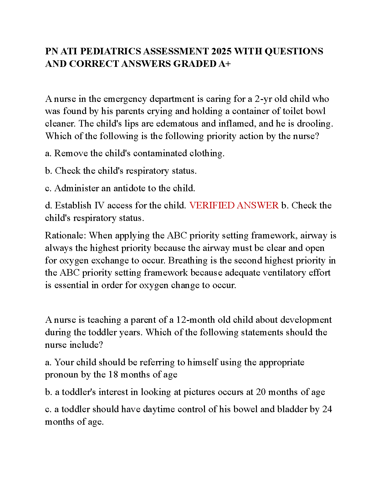 PN ATI Pediatrics Assessment 2025 Exam Practice Questions and Answers by Unknown Author