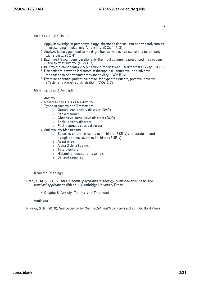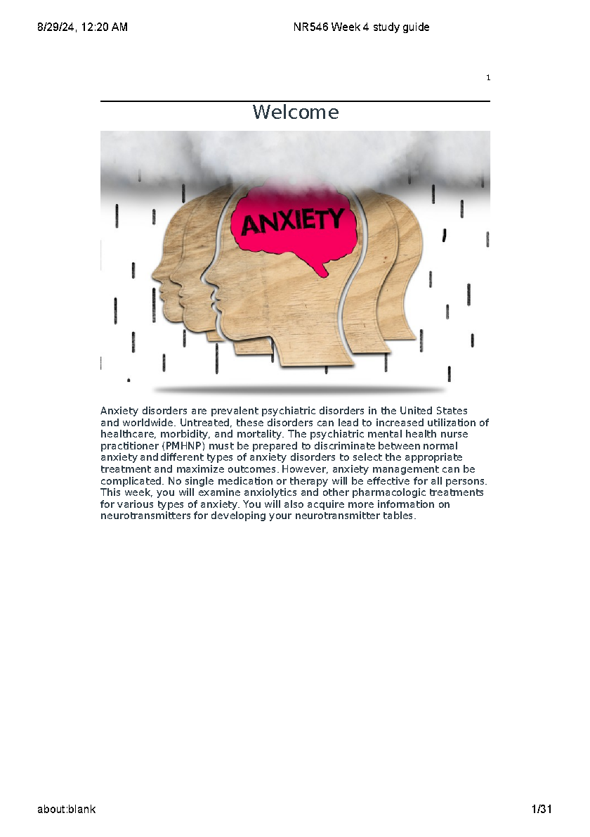 Ace your NR546 exams on the first try with this comprehensive study guide for week 4, focusing on anxiety disorders. Gain a deep understanding of various anxiety types, treatment approaches, and neurotransmitter roles to excel in your studies. Designed for 2024/2025 academic success.