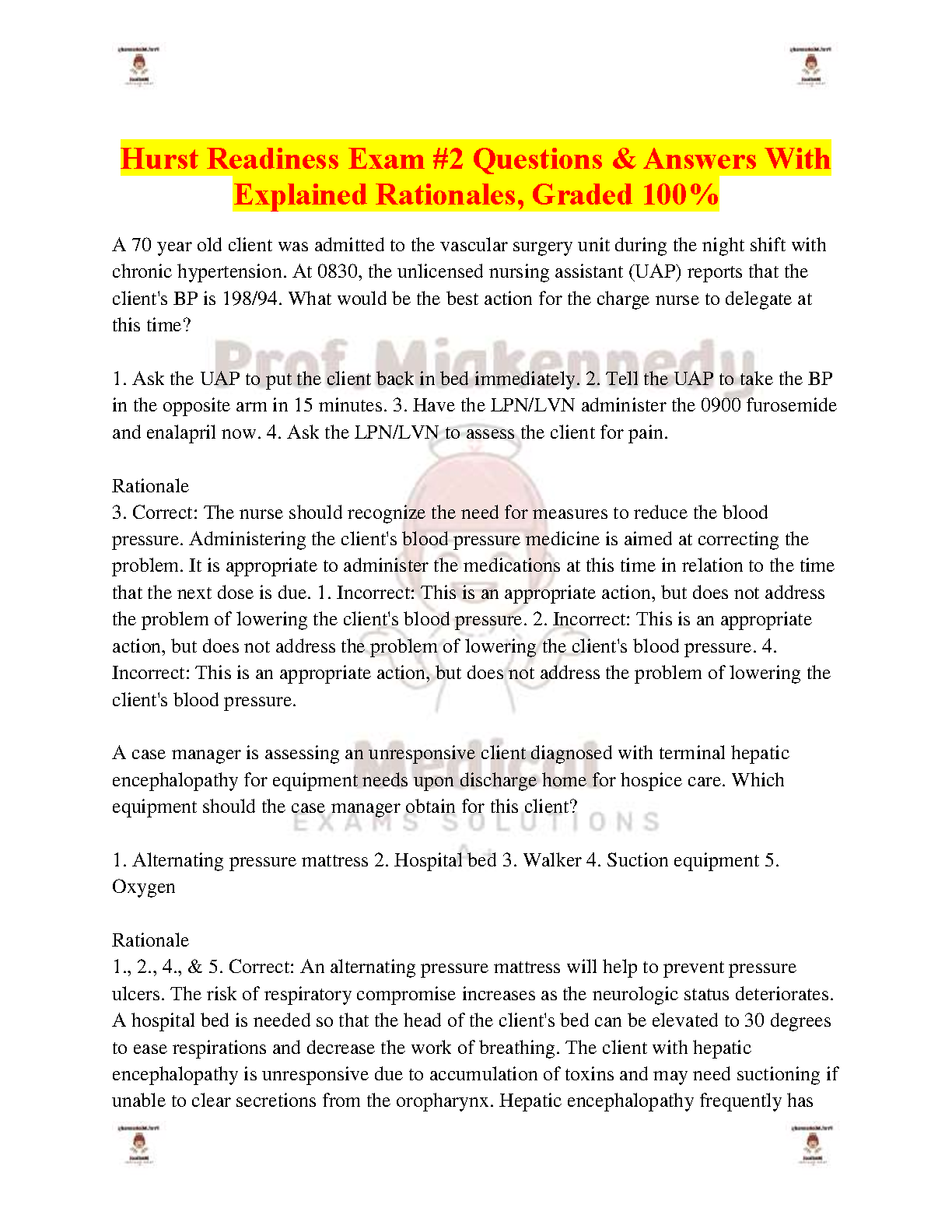 Hurst Readiness Exam #2 Questions & Answers With Explained Rationales, Graded 100% by Various Authors